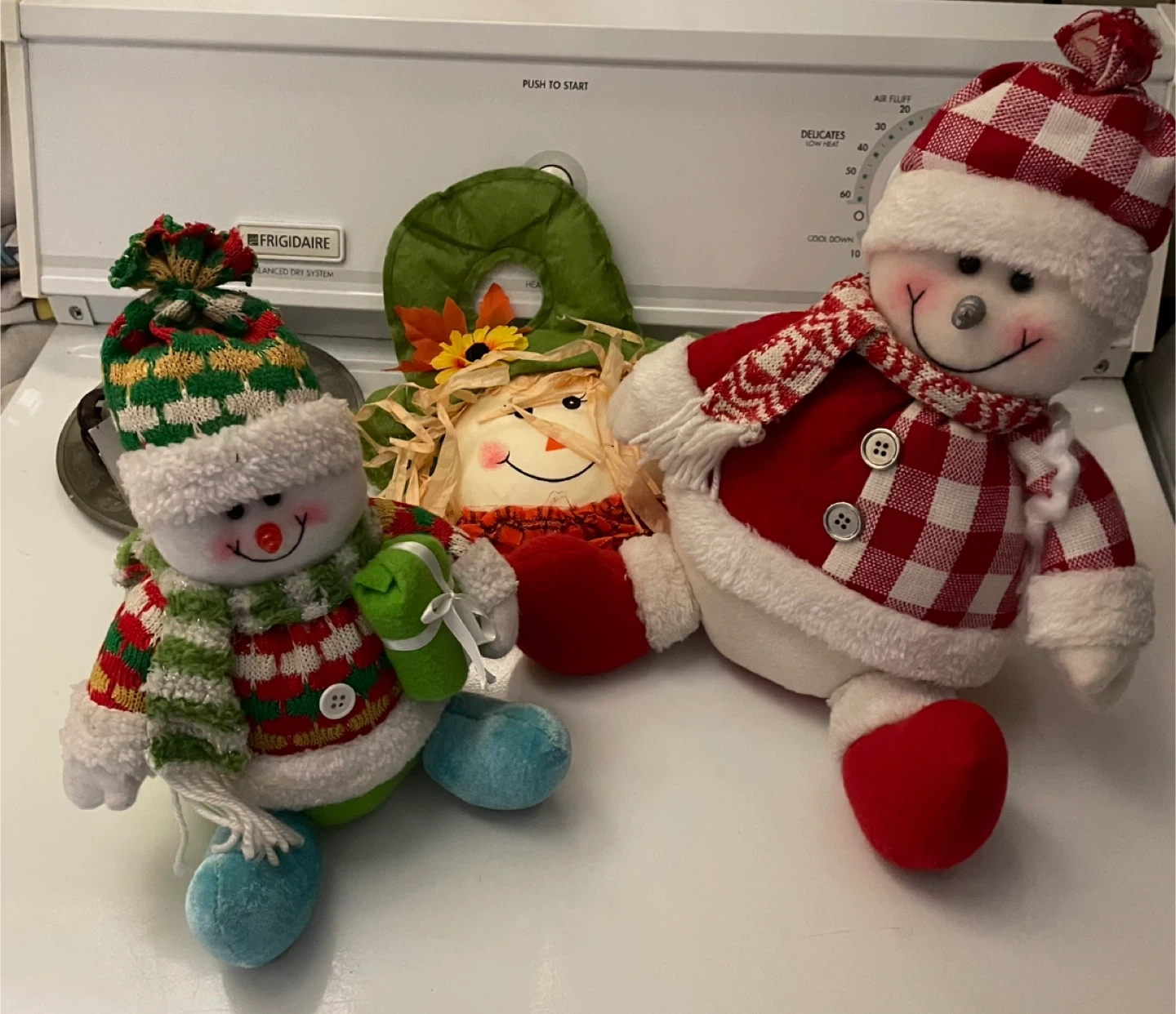 Two festive plush snowman decorations with winter attire. One wears a green and white striped hat and sweater, the other a red and white checkered hat and jacket. Both have fuzzy white trim and scarves. Plus one door hanger scarecrow head! Weighted so they sit price is for all three items