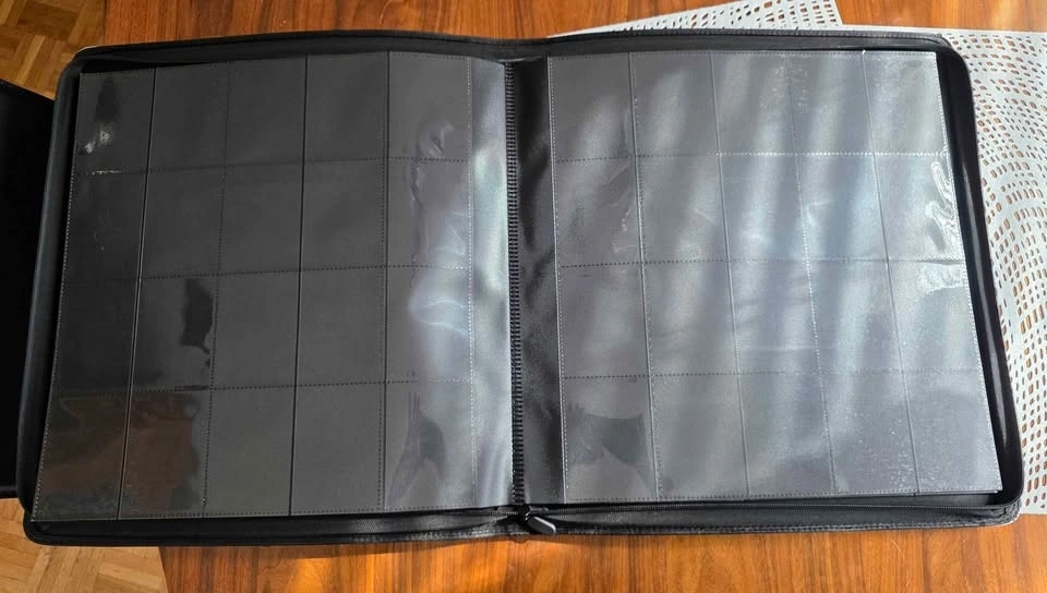 Brand new binder, never used. It has no rings and is side-loading, fitting sleeved cards nicely. It was just a bit too big for what I needed. 20 pockets. Dimensions are 17.7" x 16.5".