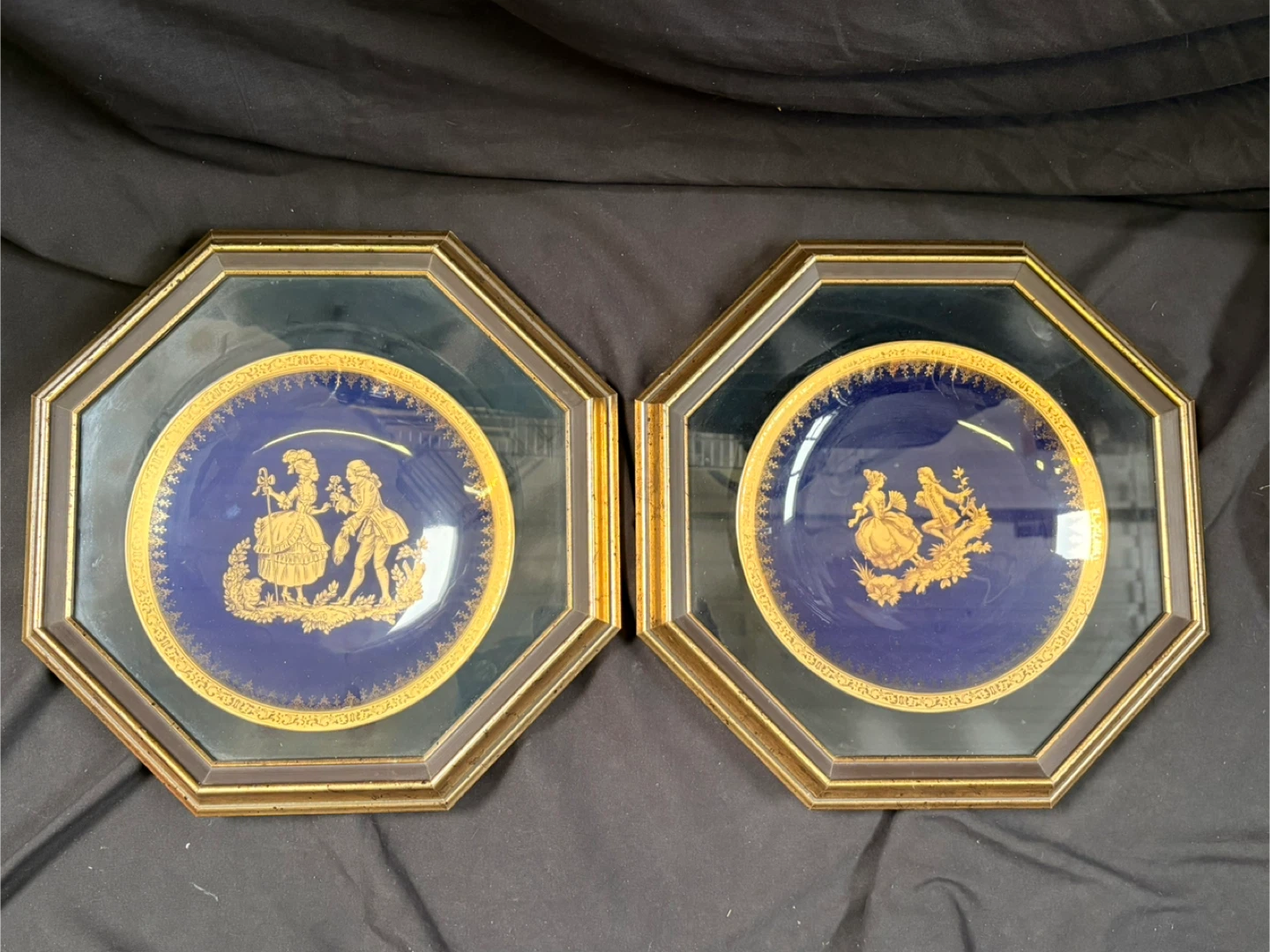 Selling a pair of framed decorative plates. They feature a lovely gold design on a dark blue background. The frames are octagonal and have a gold trim. Each plate measures approximately 14 inches in diameter.