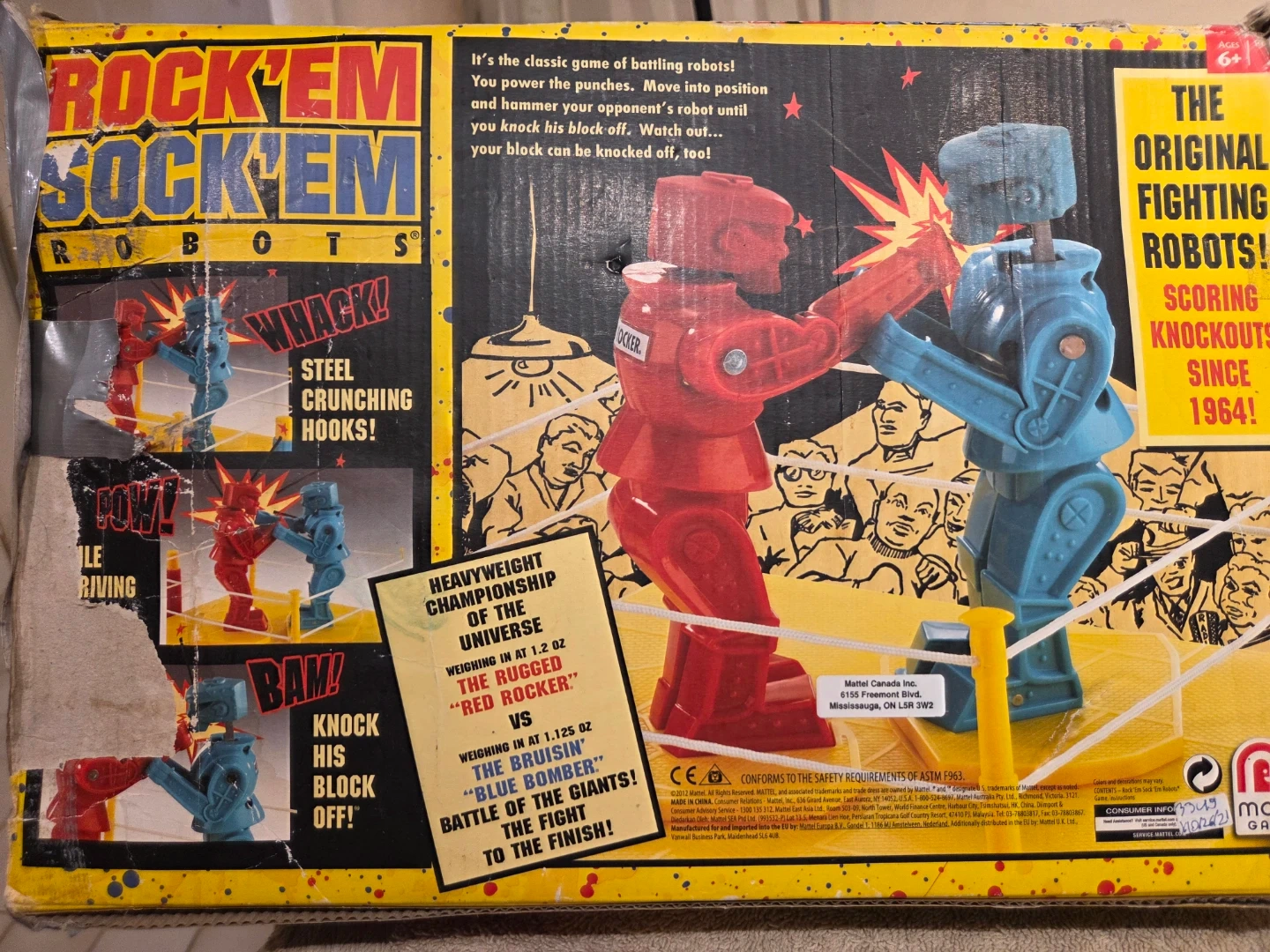 It's the classic game of battling robots! You power the punches and move into position to hammer your opponent's robot until you knock its block off. This vintage set includes two robots, the game base, and controllers. It's scoring knockouts since 1964! Box is in ruff shape, but everything else is in pristine condition..