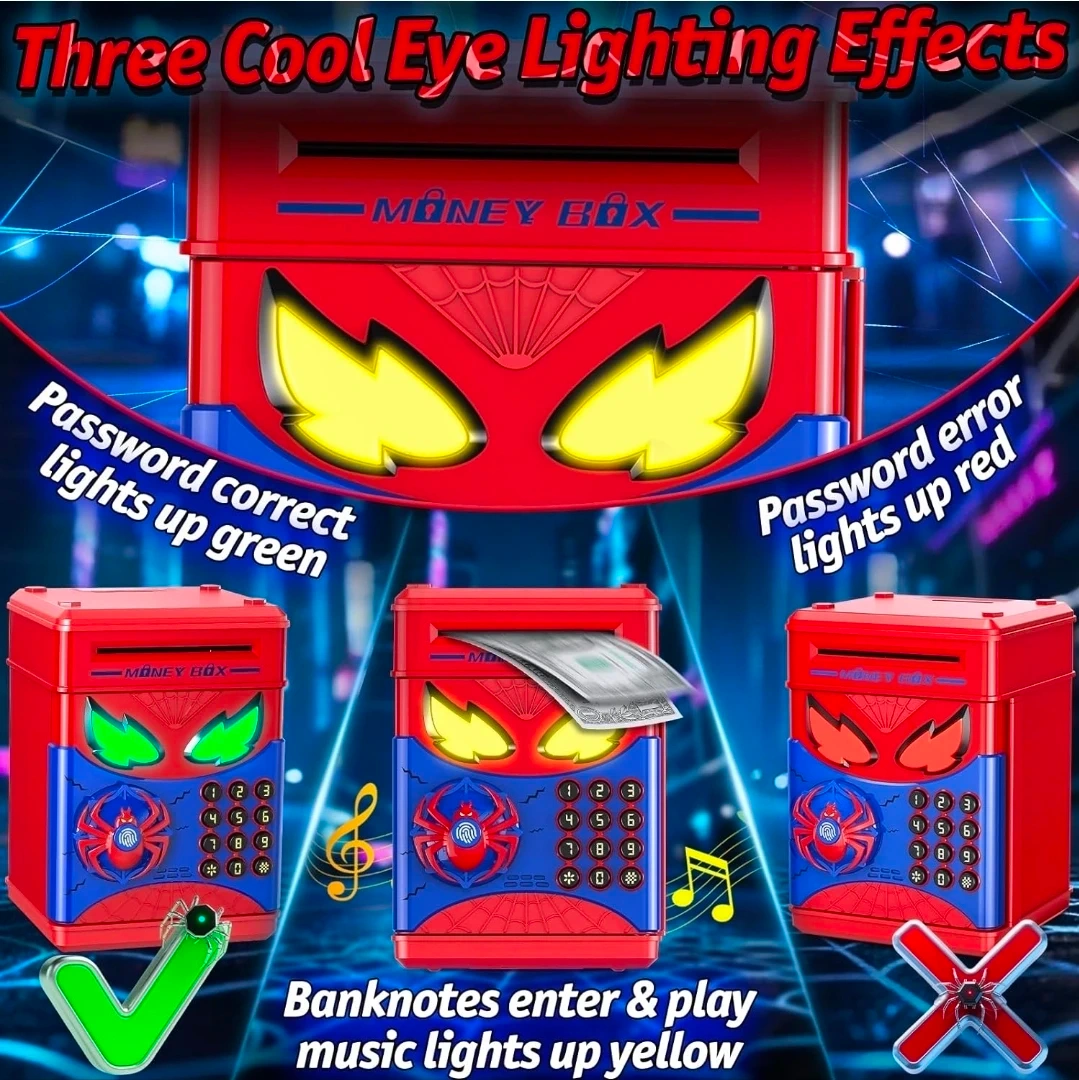 This Spiderman-themed money box features fingerprint simulation and an electronic ATM keypad for secure savings. It's designed with cool eye lighting effects that change colour based on password entry success. Banknotes automatically enter, and it's great for kids aged 3 and up!