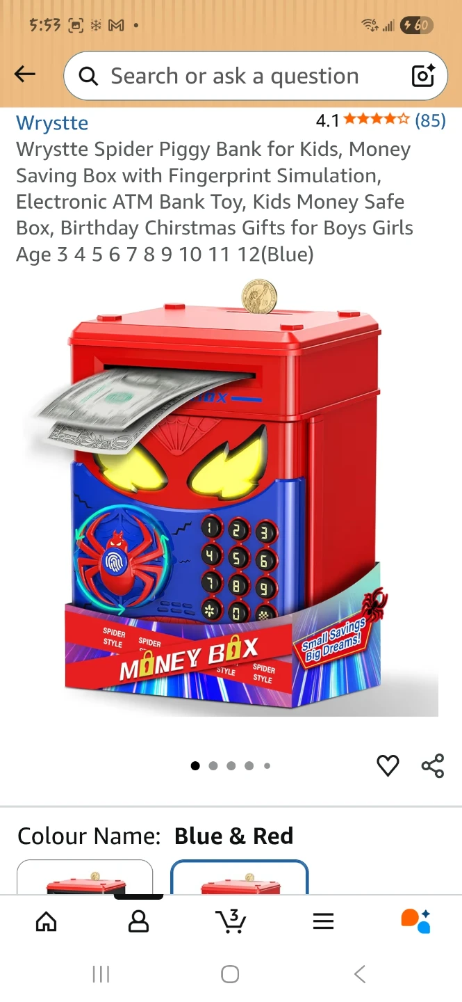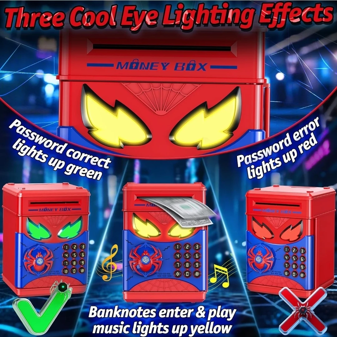This Spiderman-themed money box features fingerprint simulation and an electronic ATM keypad for secure savings. It's designed with cool eye lighting effects that change colour based on password entry success. Banknotes automatically enter, and it's great for kids aged 3 and up!