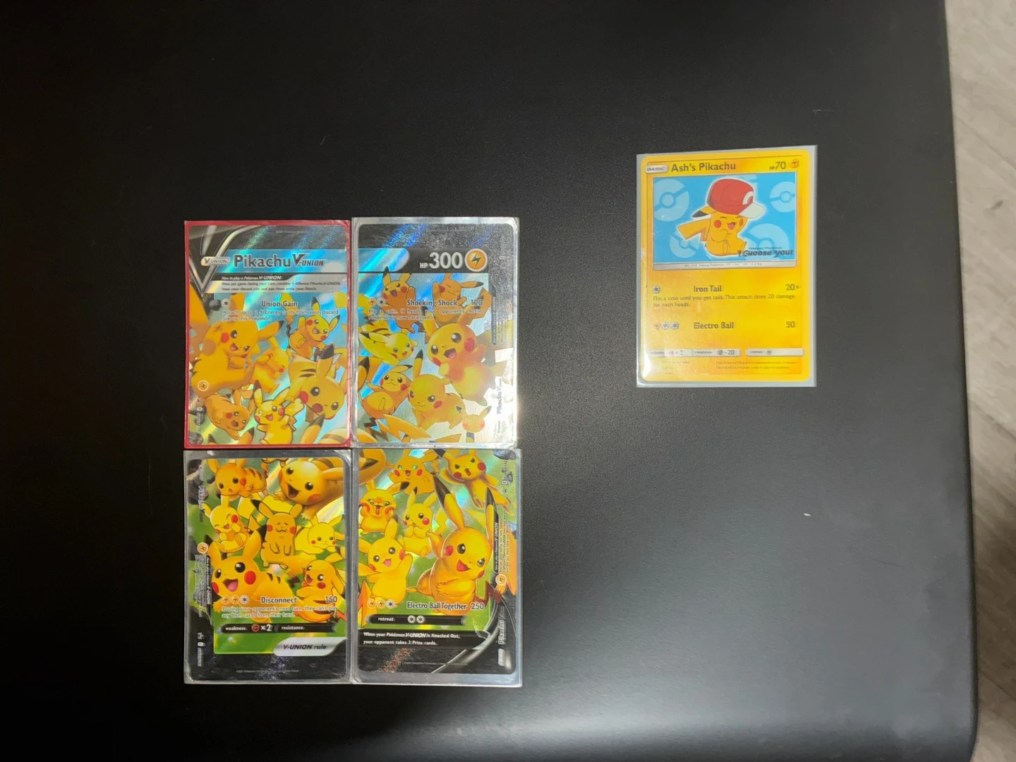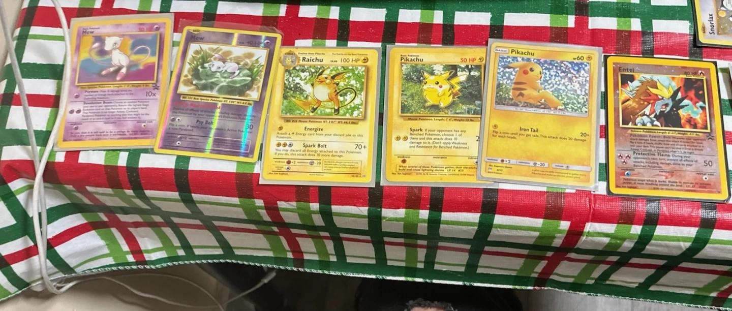 Collection of various Pokemon trading cards featuring popular characters. Includes multiple Pikachu cards, Mew, Raichu, and Entei.