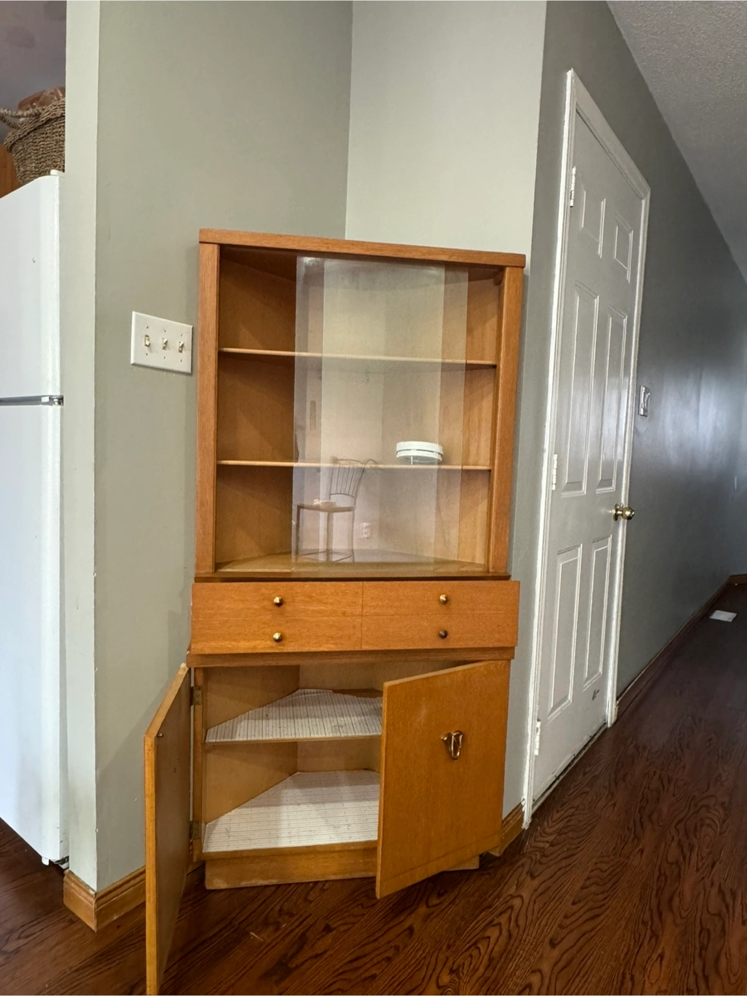 Wooden Corner Display Cabinet with Glass Doors and Drawers