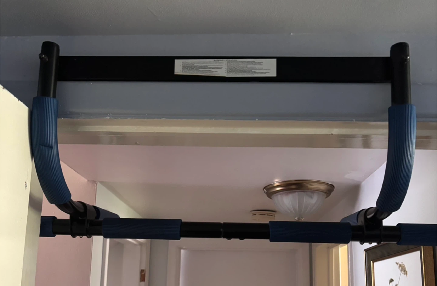 Multi function doorway mount pull up bar. Hangs on door frame or lay on floor for full body workout. Upper body , sit ups and push ups etc.