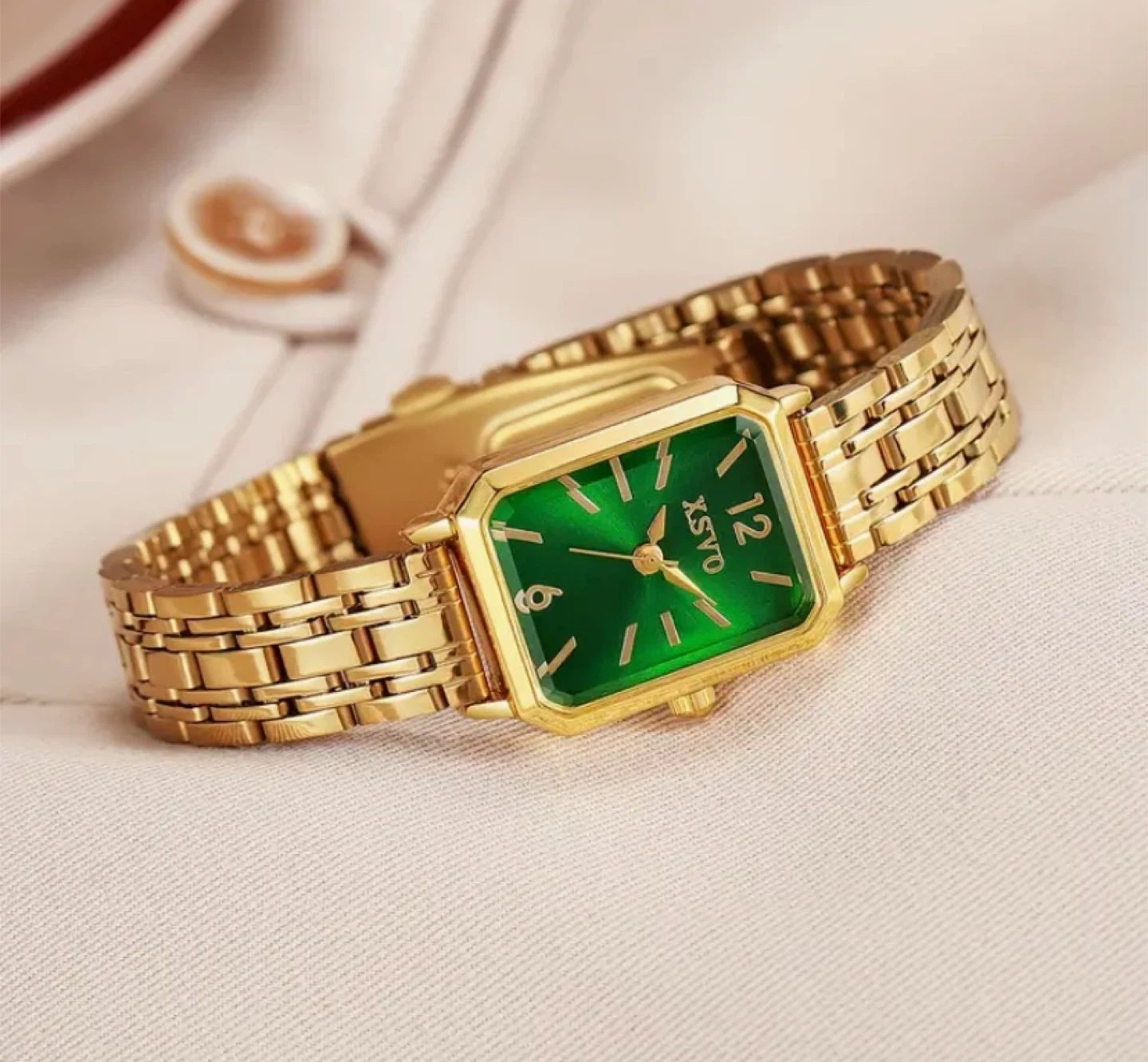 Selling a beautiful XSVO women's watch! It features a gold band and a striking green face. It's a stylish and eye-catching accessory that would make a great addition to any outfit.