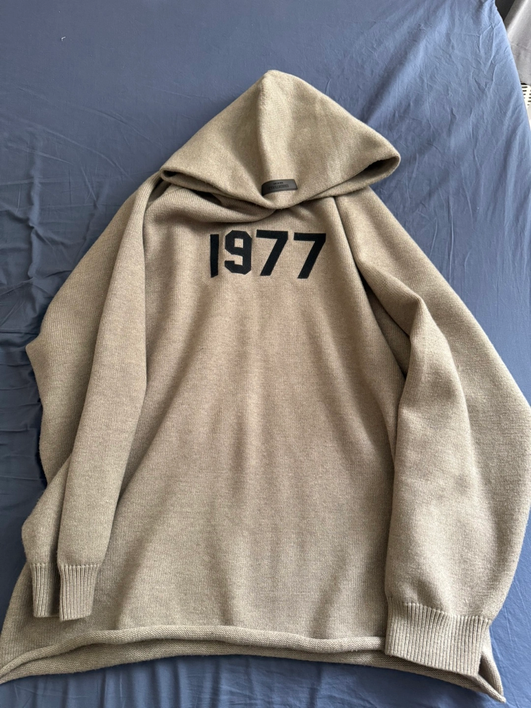 Fear of God Essentials oversized knit hoodie. Size XXL. Features a large 1977 graphic on the front. Light taupe colour. Relaxed fit.
