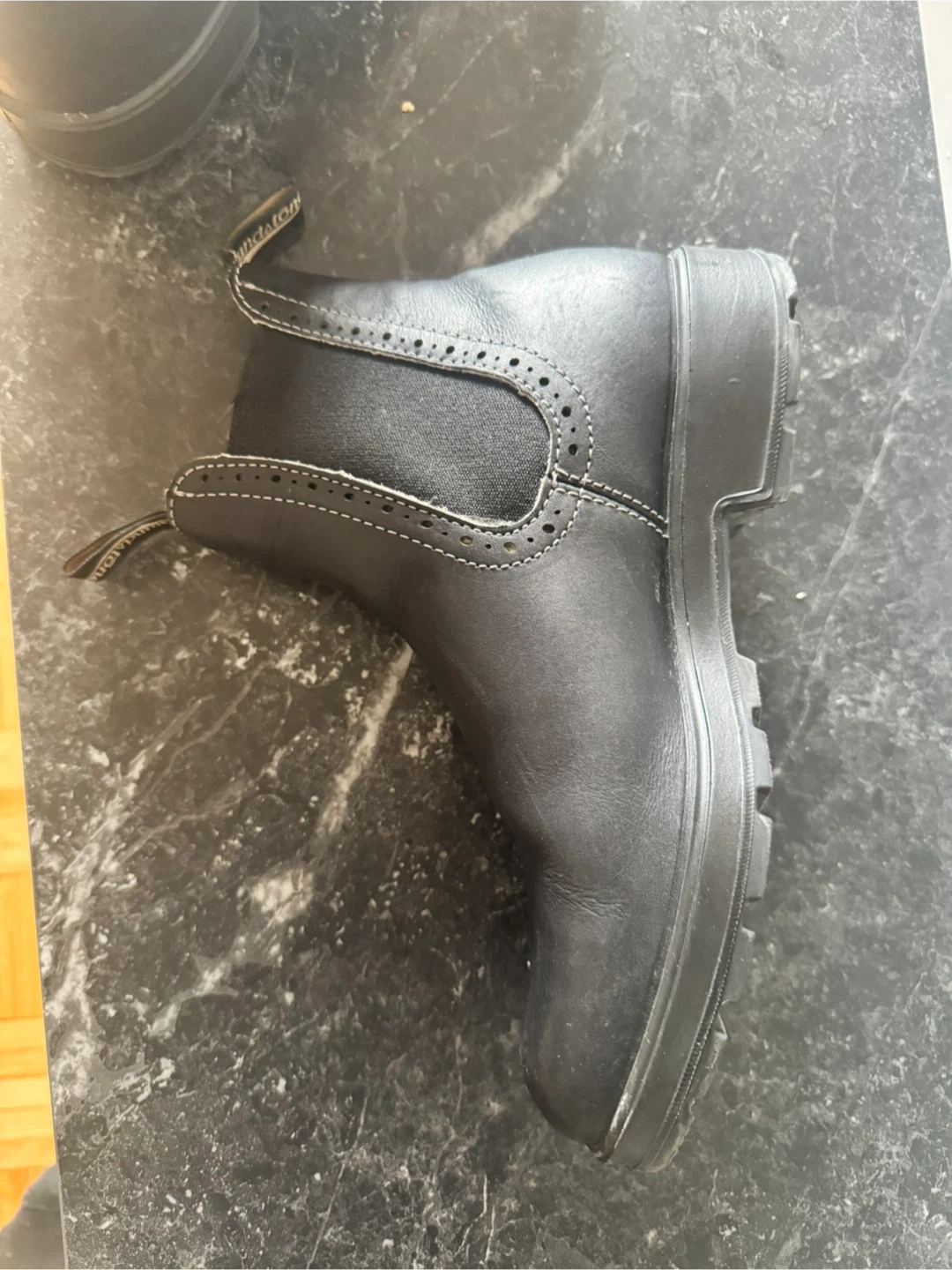 Classic Blundstone Chelsea boots in black leather. These pull-on boots feature elasticated side panels and a durable sole. It is slightly used. Thank you