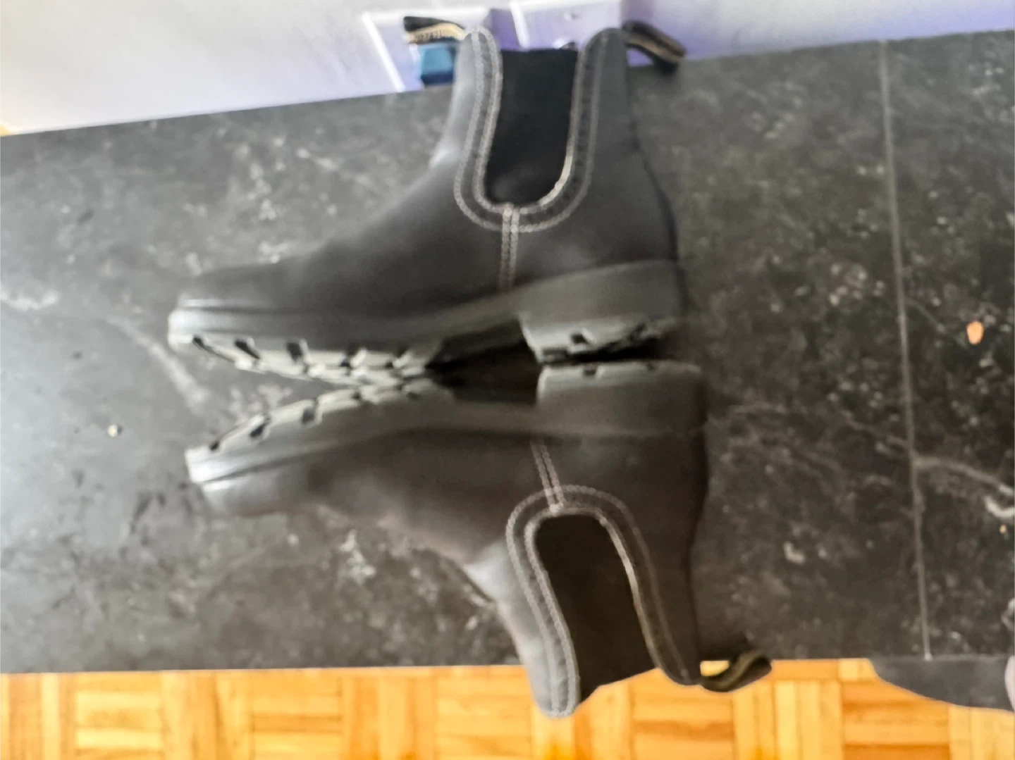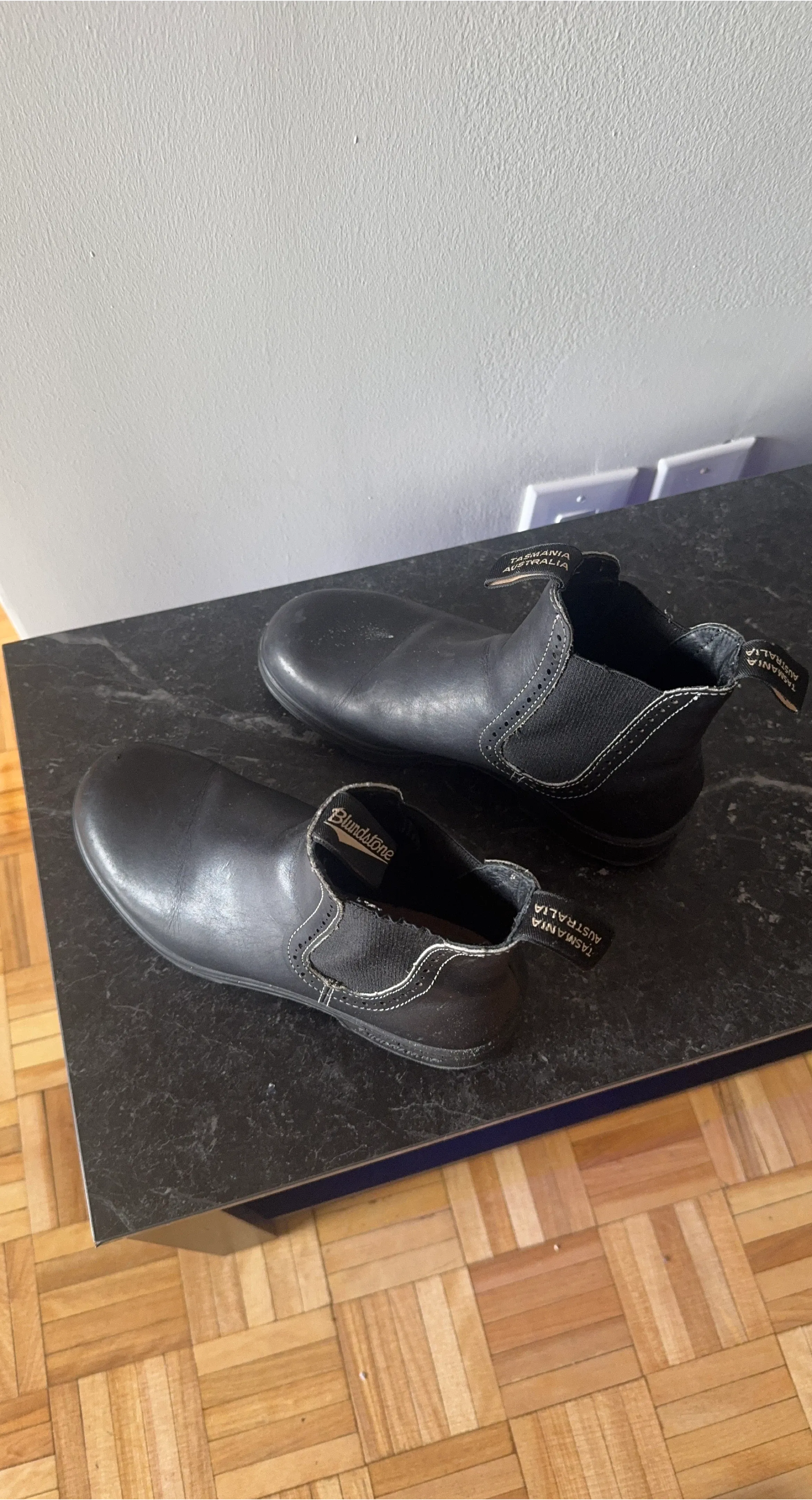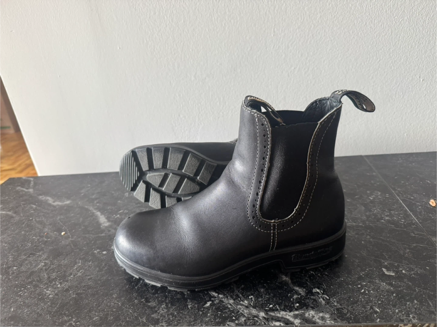 Classic Blundstone Chelsea boots in black leather. These pull-on boots feature elasticated side panels and a durable sole. It is slightly used. Thank you