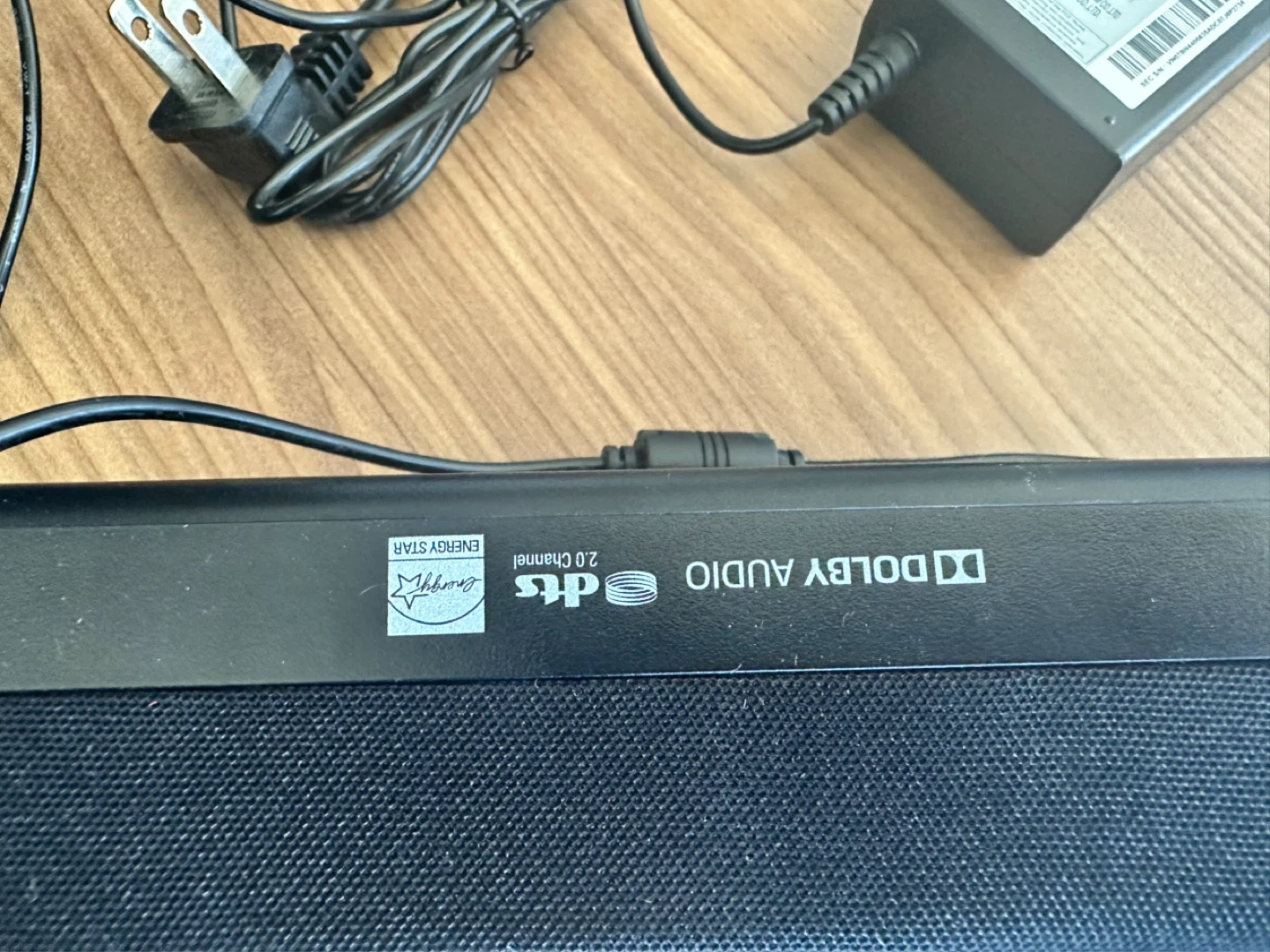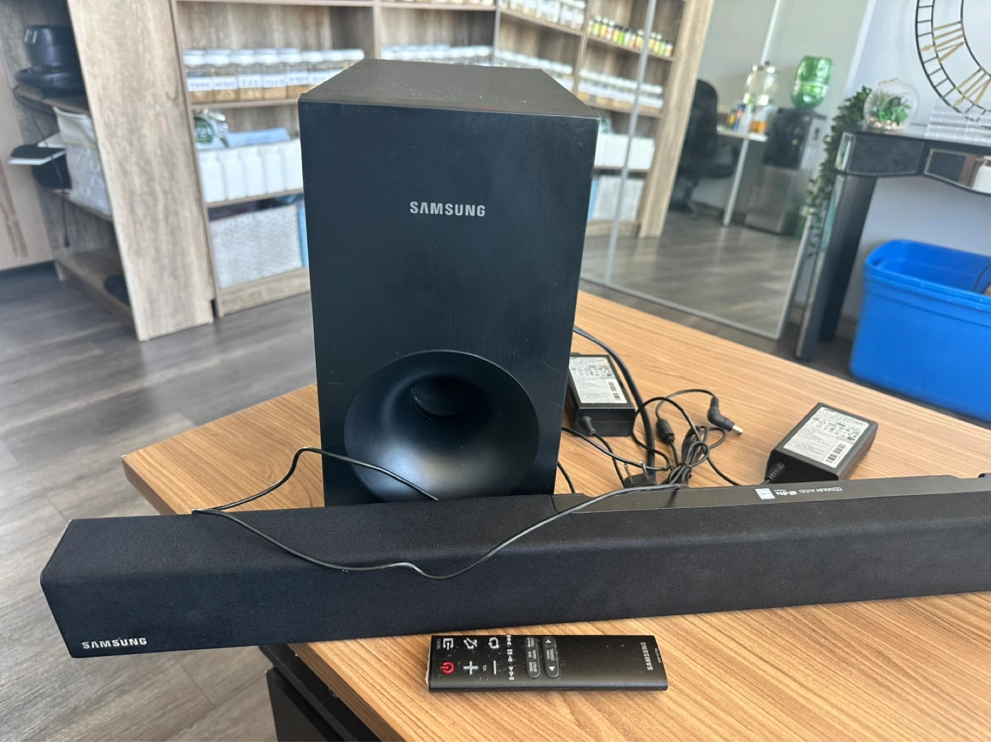 Samsung soundbar and subwoofer system with remote control and power adapters. Features Dolby Audio and DTS 2.0 Channel support. Energy Star certified.