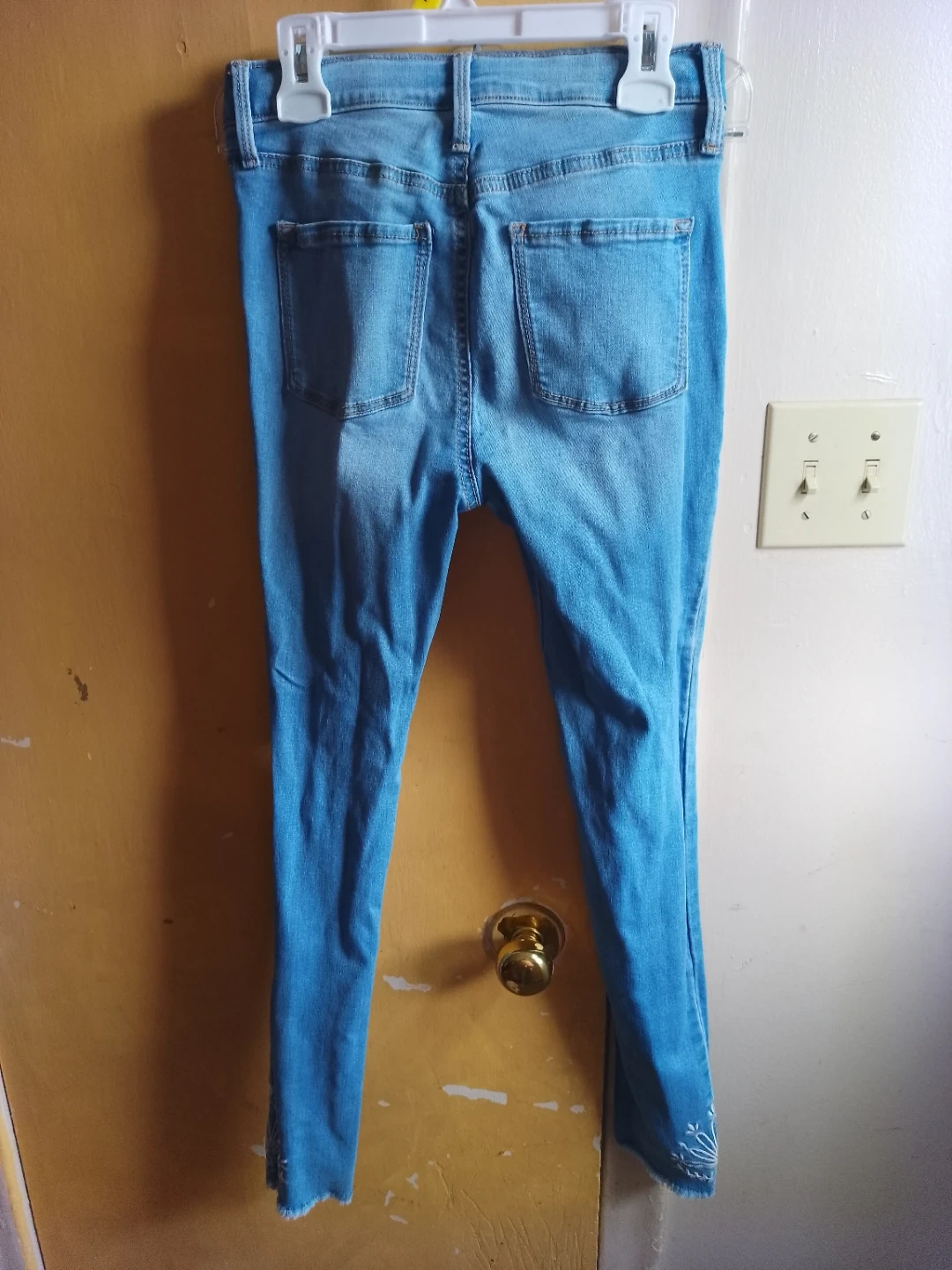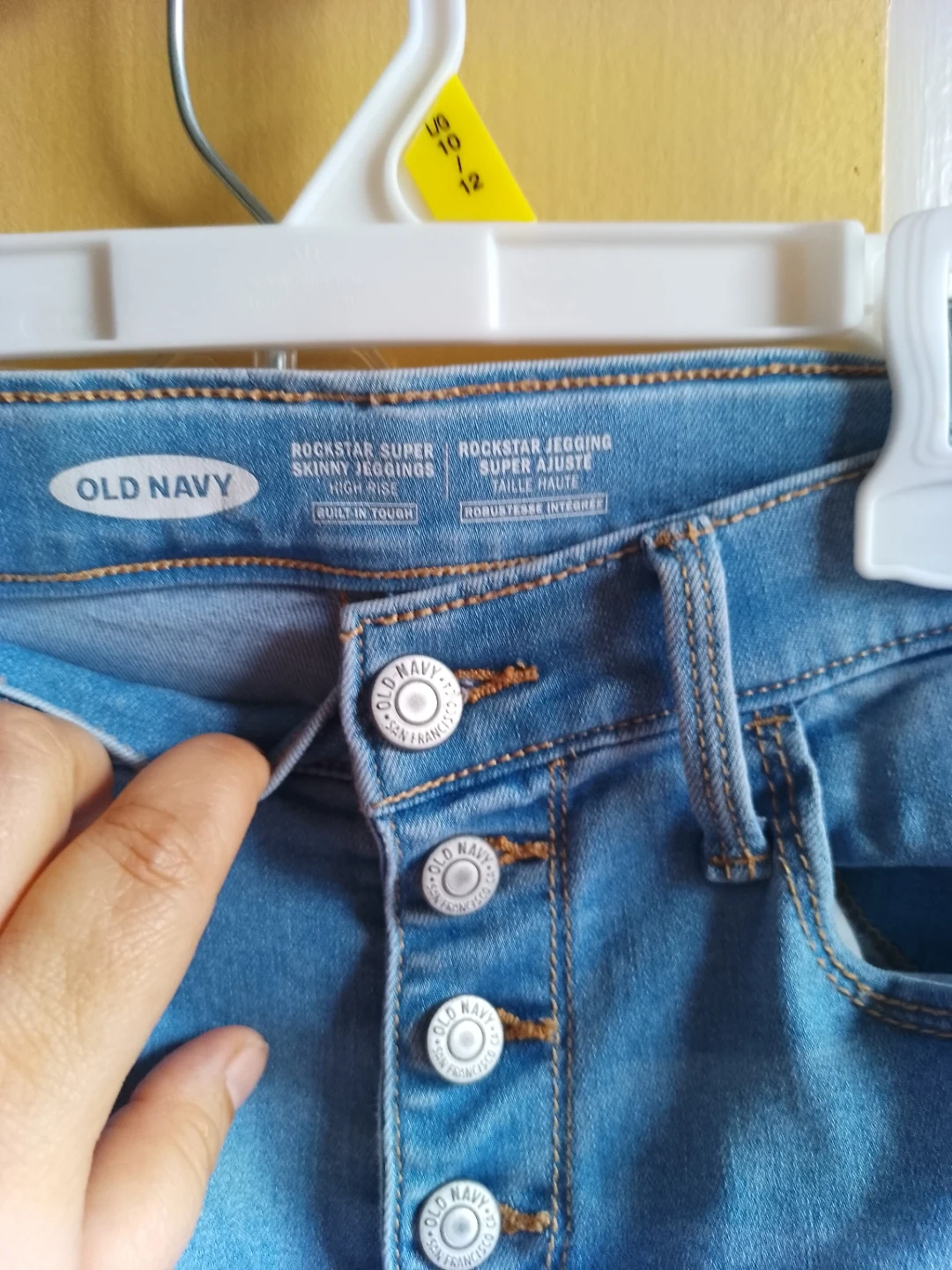 These are Old Navy Rockstar Super Skinny Jegging jeans in a light wash. They feature a high-rise fit and a button-fly closure. Some subtle embroidery is visible on the hem.