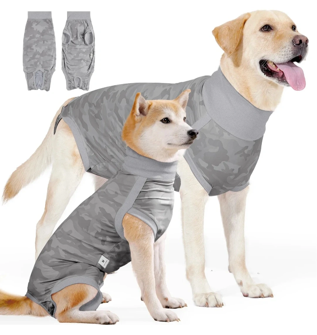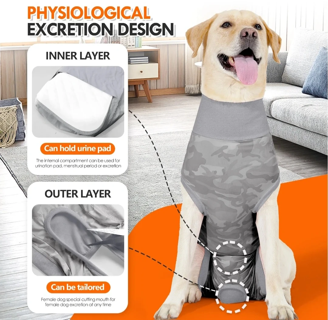 This lick-proof dog recovery suit offers high elasticity for freedom of movement. It features a physiological excretion design and can hold a urine pad. Its design is skin-friendly and offers a full suit high bounce.