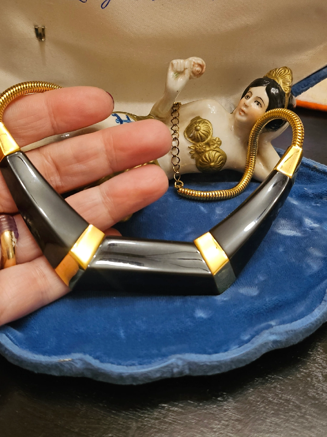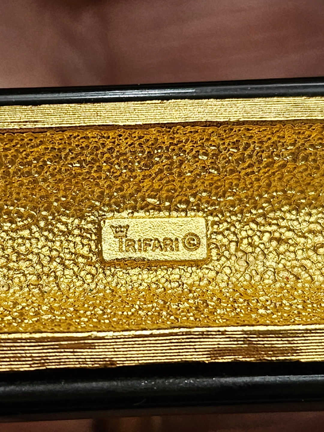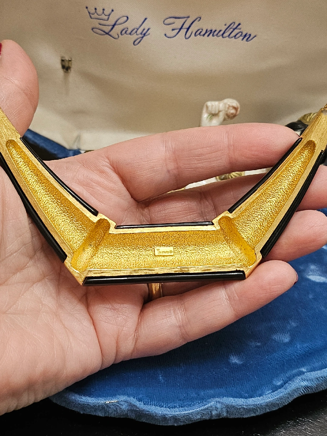 Selling a striking Trifari necklace featuring a bold black and gold design. It's in great condition . A stylish statement piece to add to your collection!box is not included