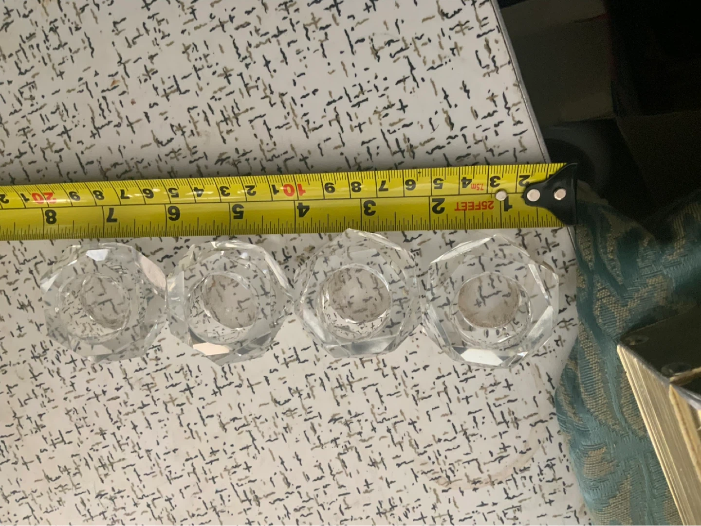 Set of 4 crystal tea light holders. Each holder measures approximately 2.5 inches wide. Glass material. These are perfect for creating a warm ambiance during dinners or special occasions!
