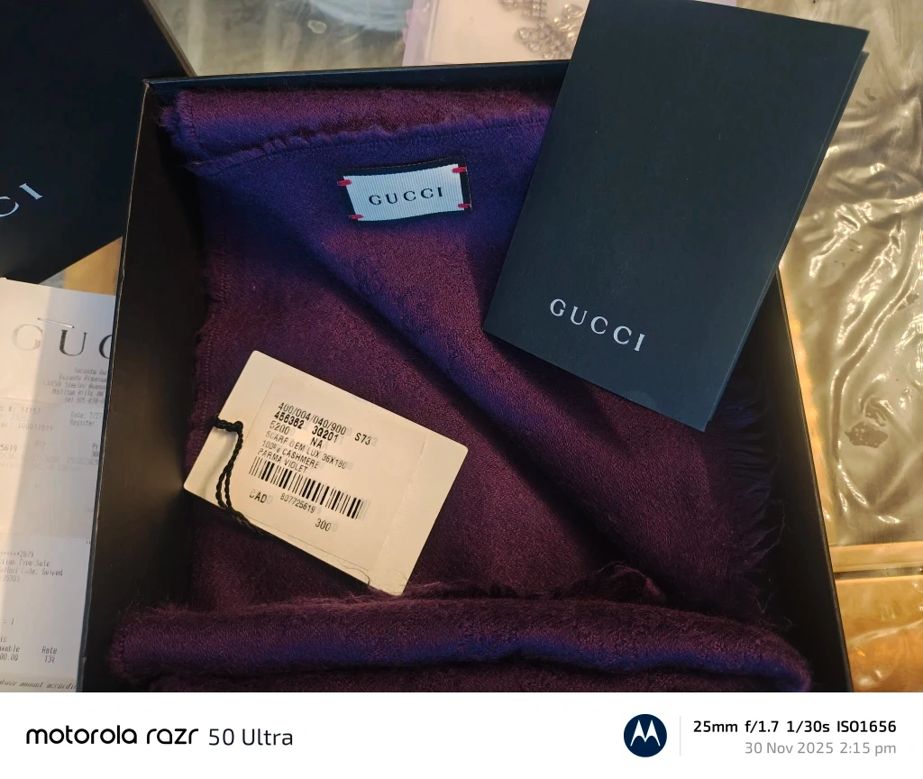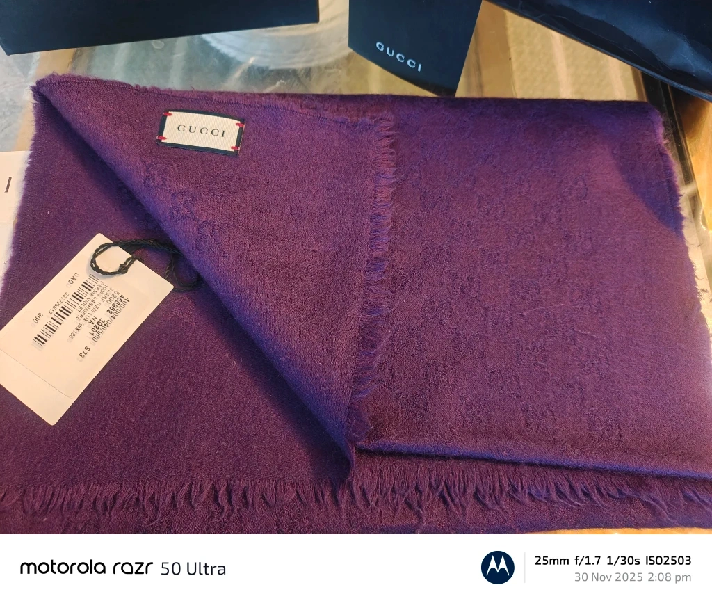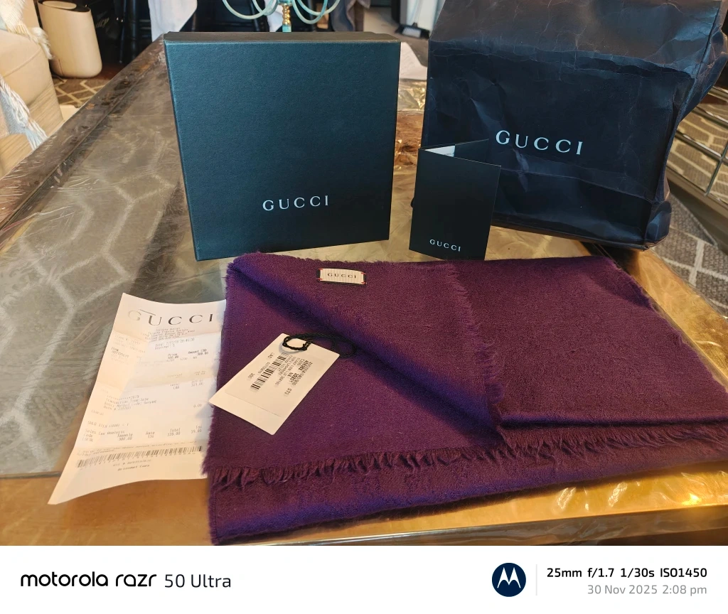 Selling a like new Gucci Orignal scarf in a beautiful Violet colour. It's made of pure wool and measures 36x180 cm. The scarf comes with its original box and packaging. Originally bought for $339 CAD.