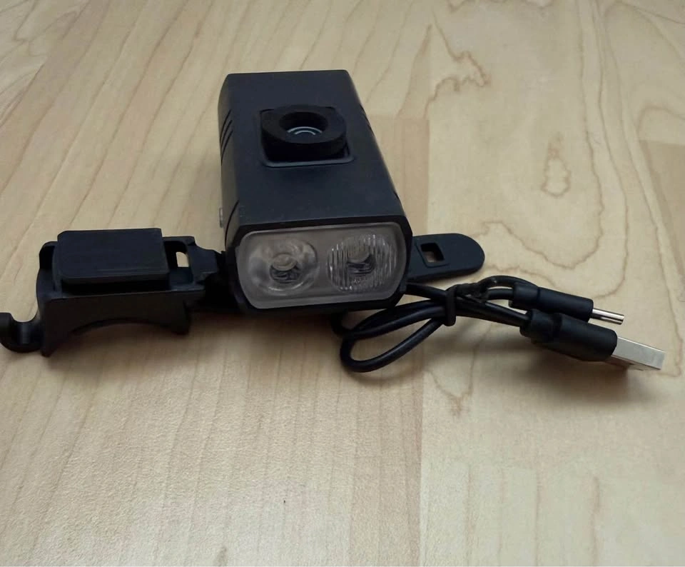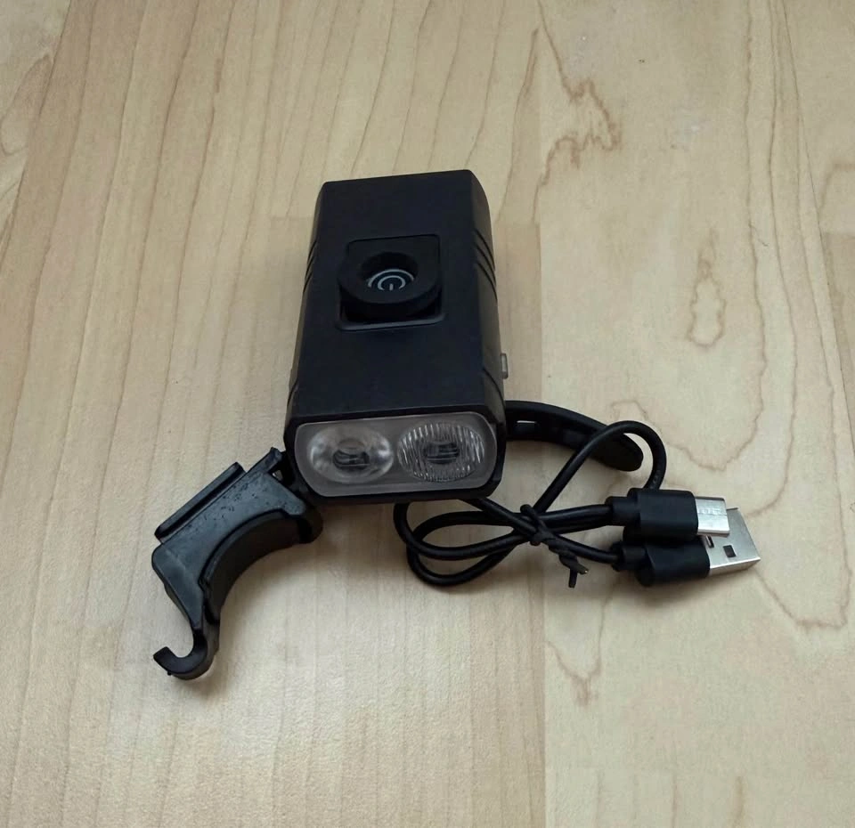 Powerful front bike light for safe night riding! Super bright dual LED headlights with 6 brightness levels. Features Type-C fast charging and includes an adjustable mounting bracket that fits most handlebars.