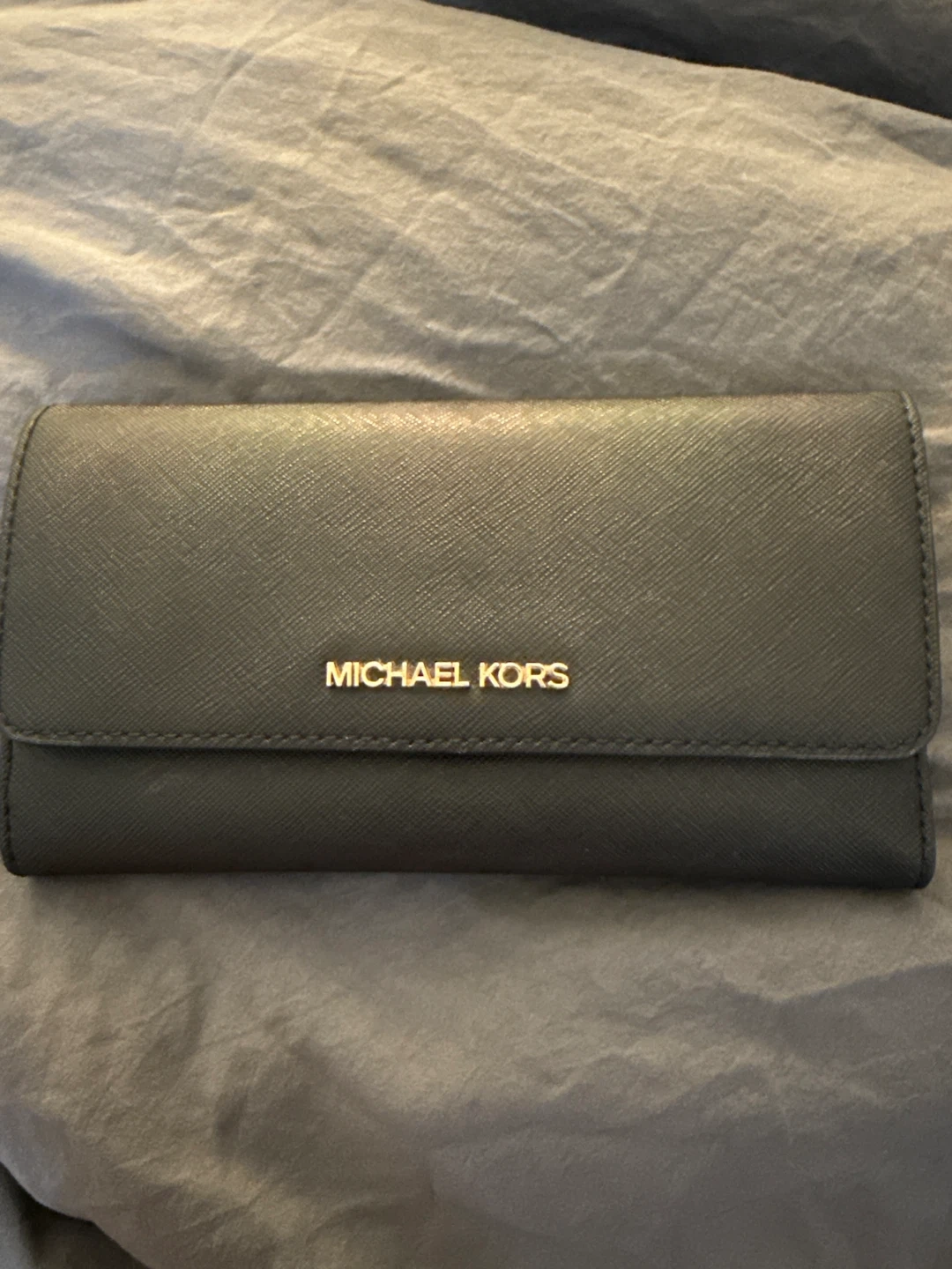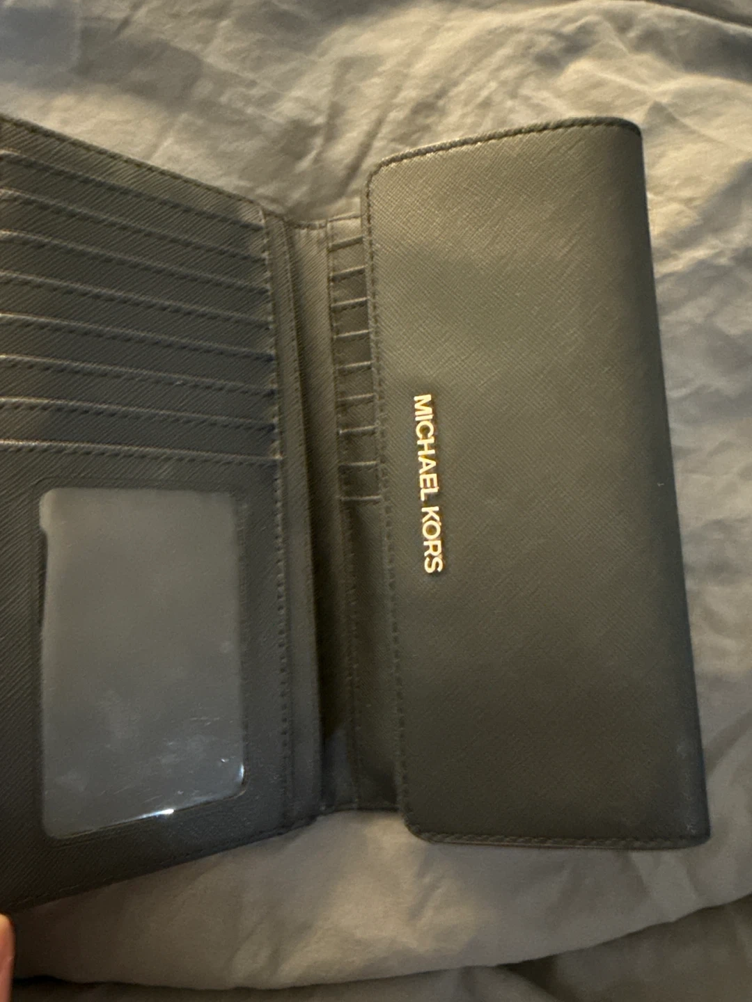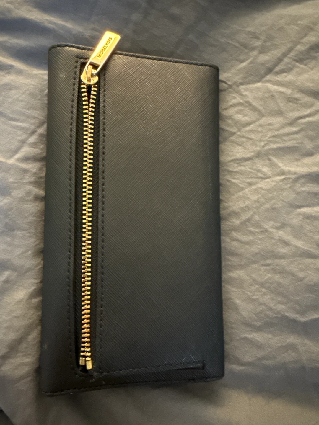 Michael Kors wallet with multiple card slots and a zippered coin pocket. It's made of textured leather. This wallet is useful for organizing your essentials.