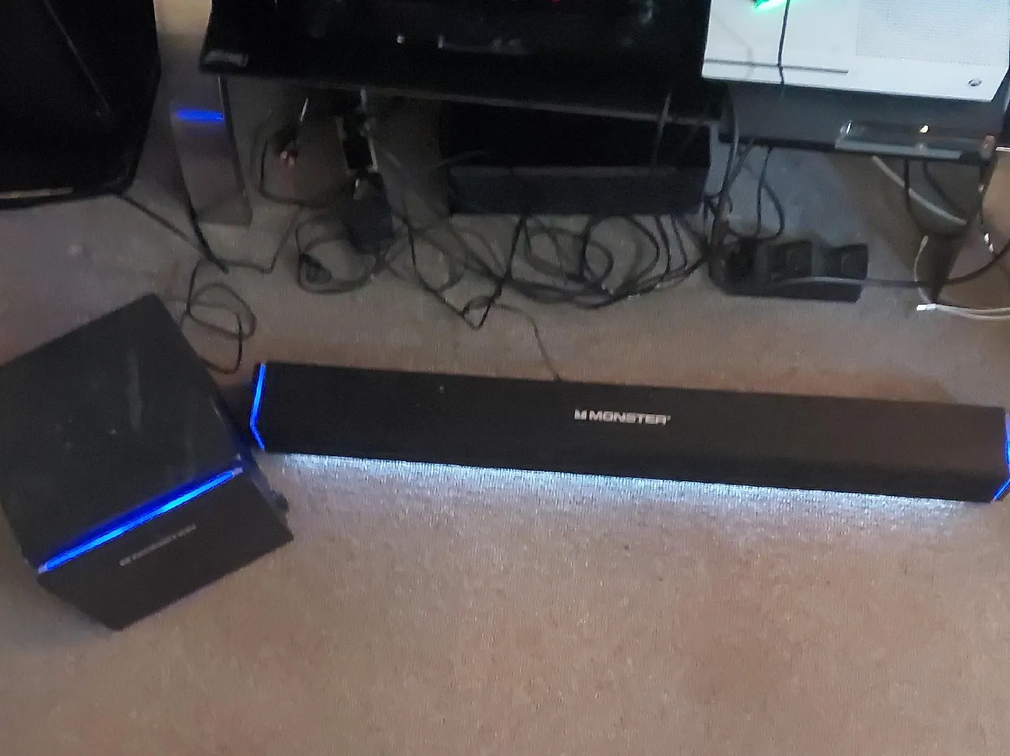 Selling a Monster soundbar with a subwoofer! This set is perfect for enhancing your home theatre experience. Both the soundbar and subwoofer feature cool blue LED accents.