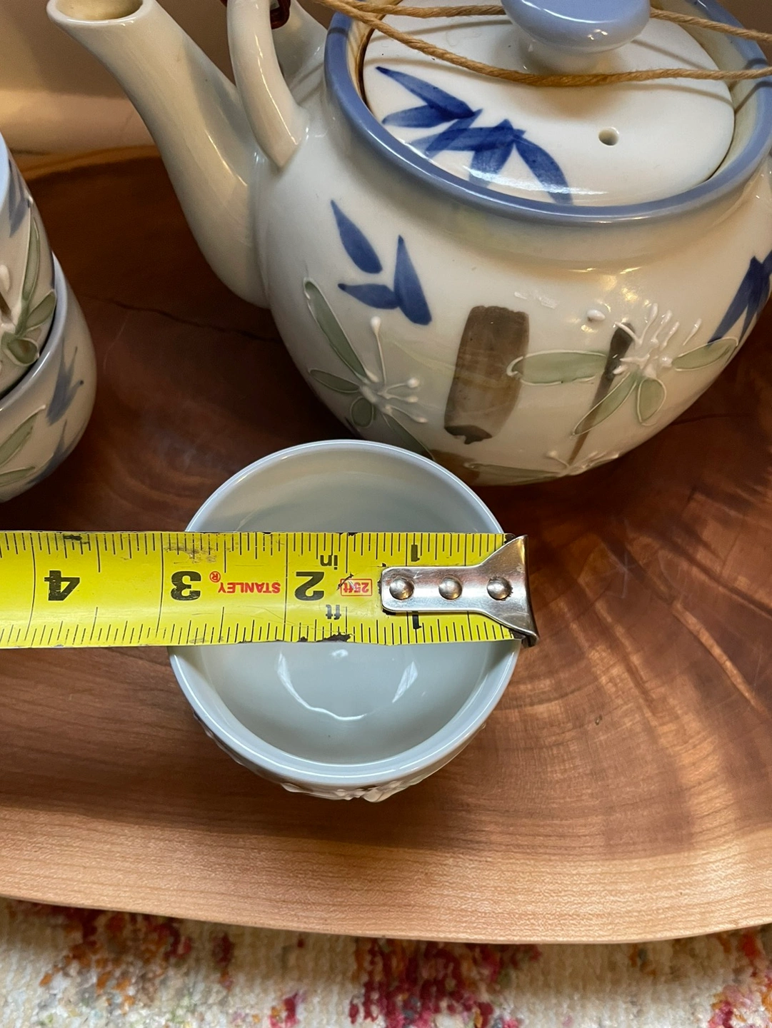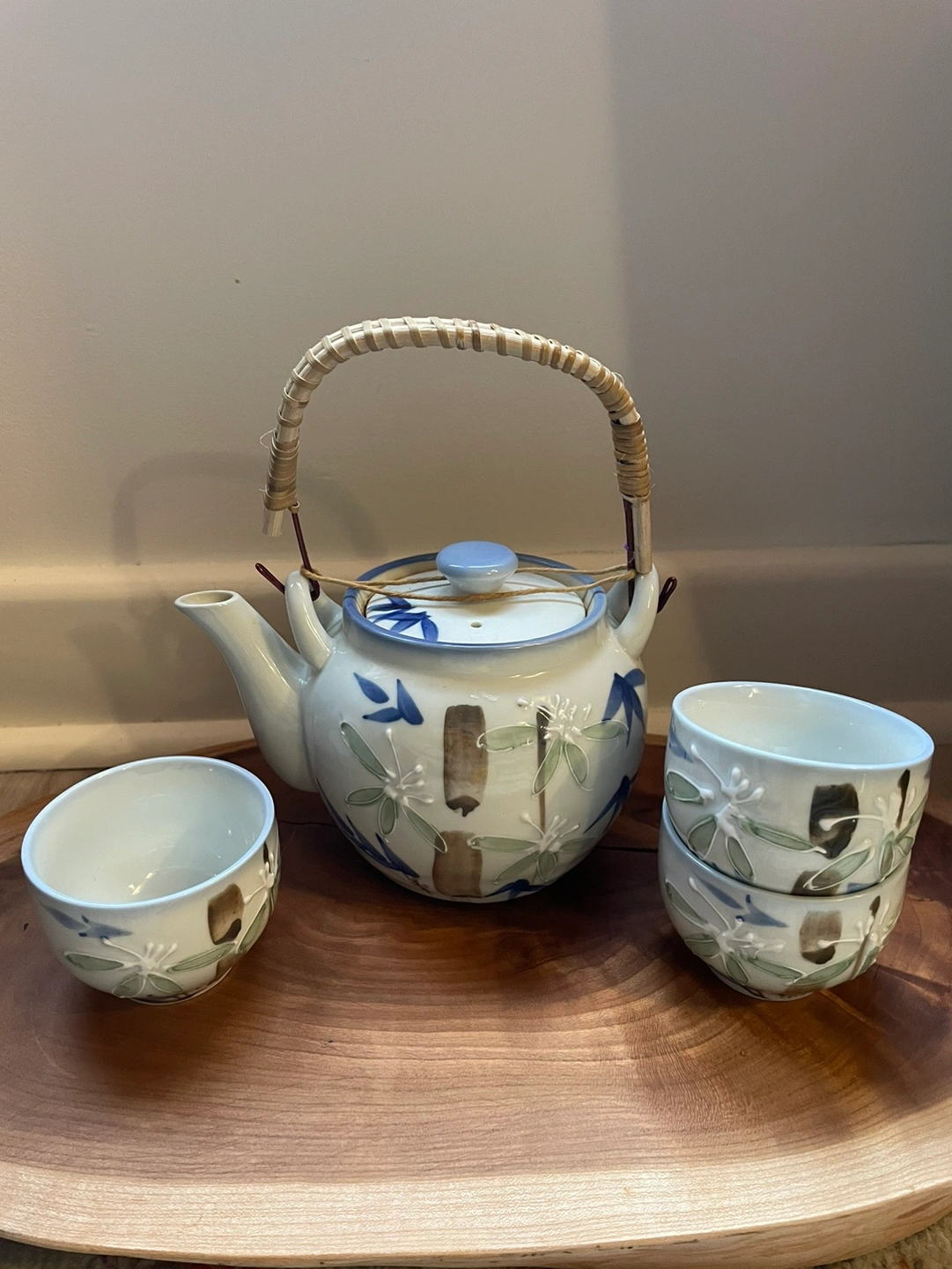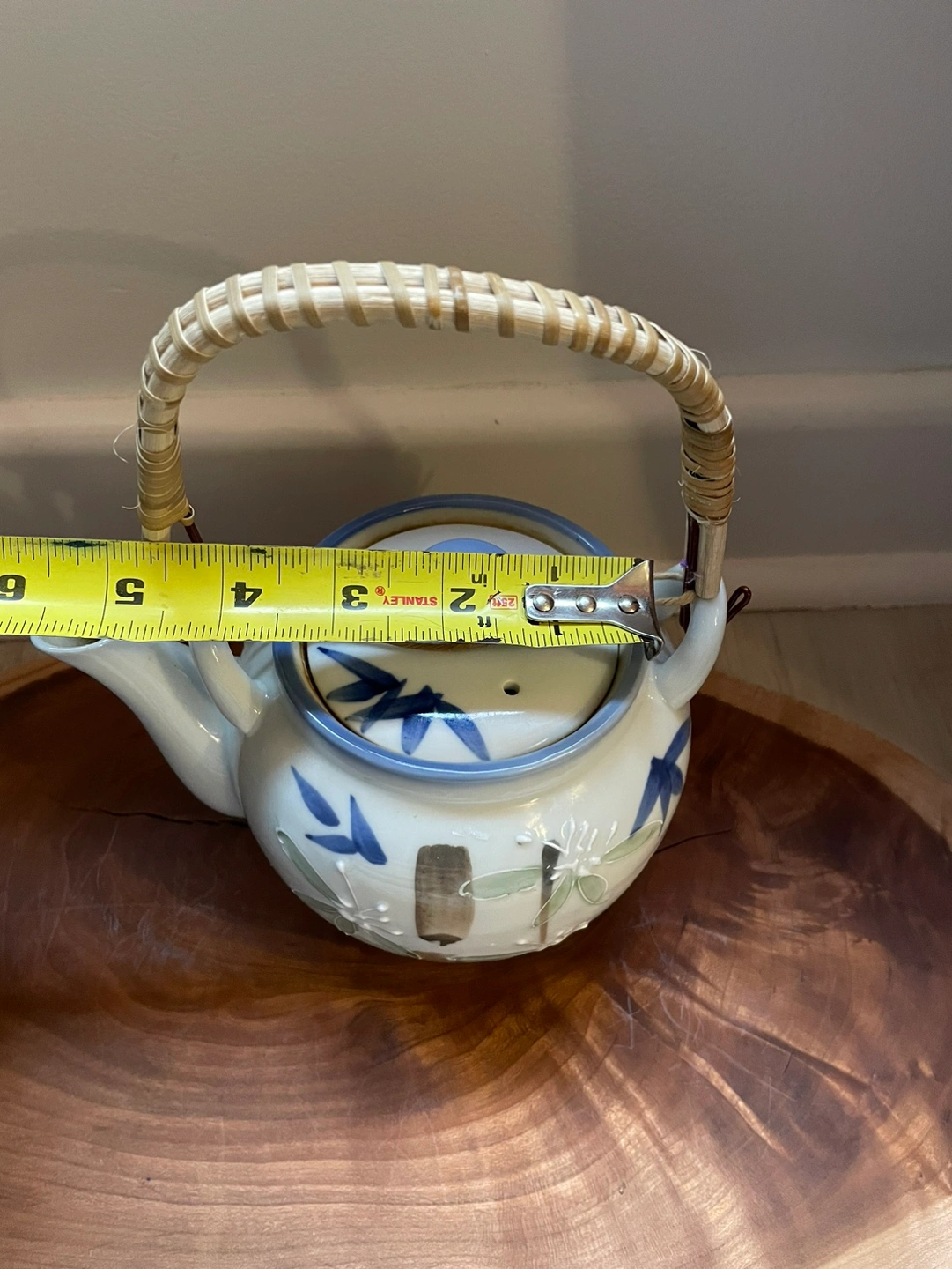 Very cute ceramic teapot with bamboo handle and floral design painted on, with 3 matching handleless mugs. All measurements provided in photos.