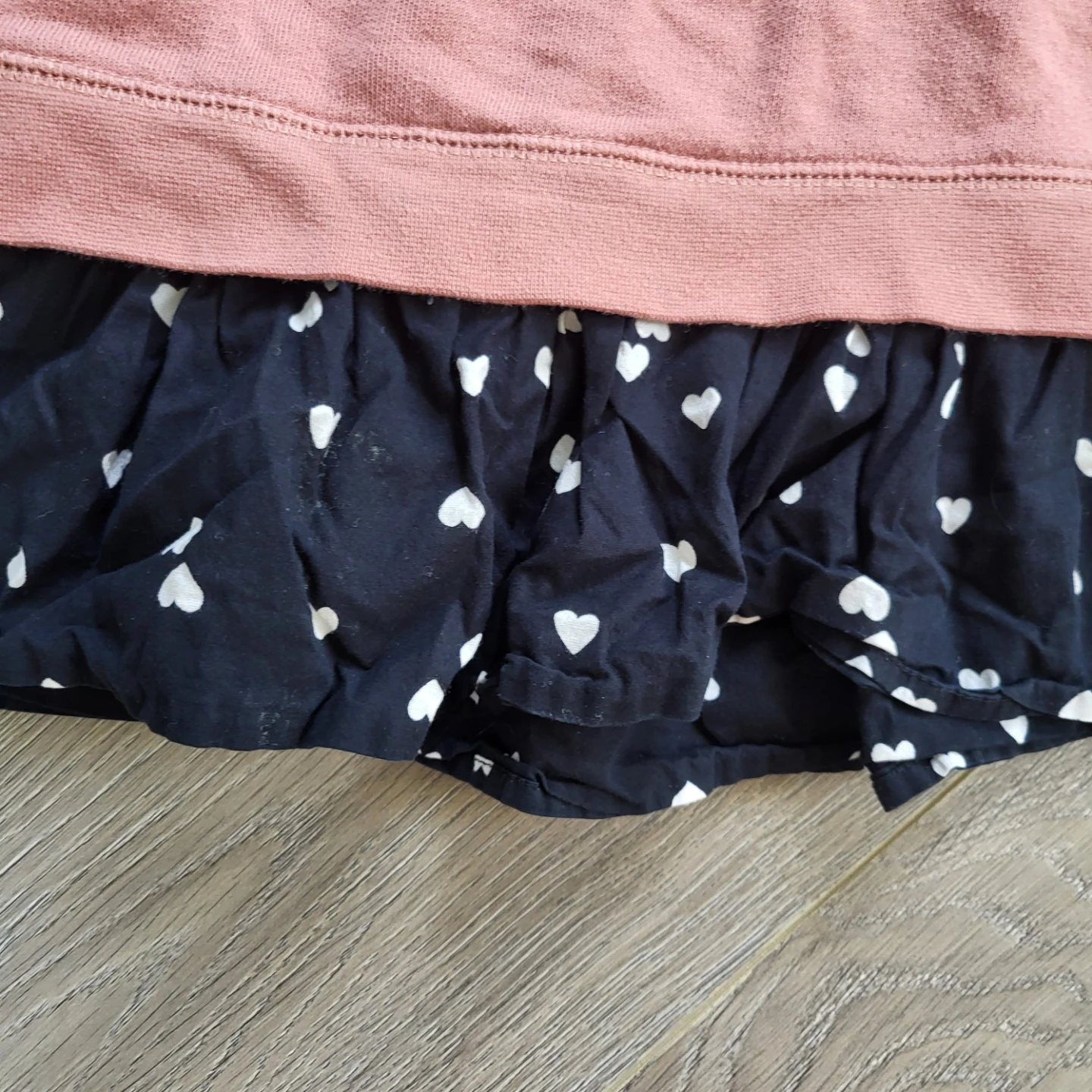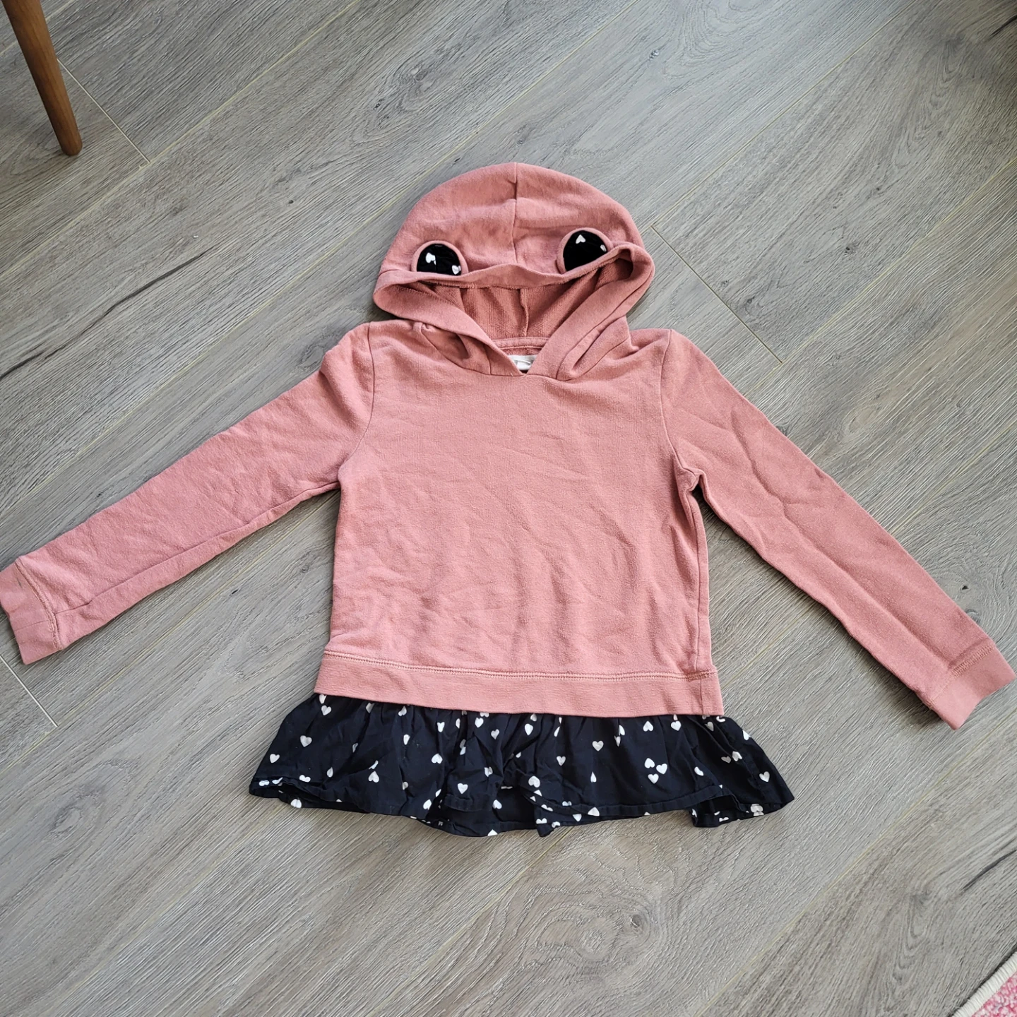 Super cute girls' hoodie from Nordstroms. It features a pink hoodie top with adorable details on the hood, and a black ruffle with a white heart pattern.