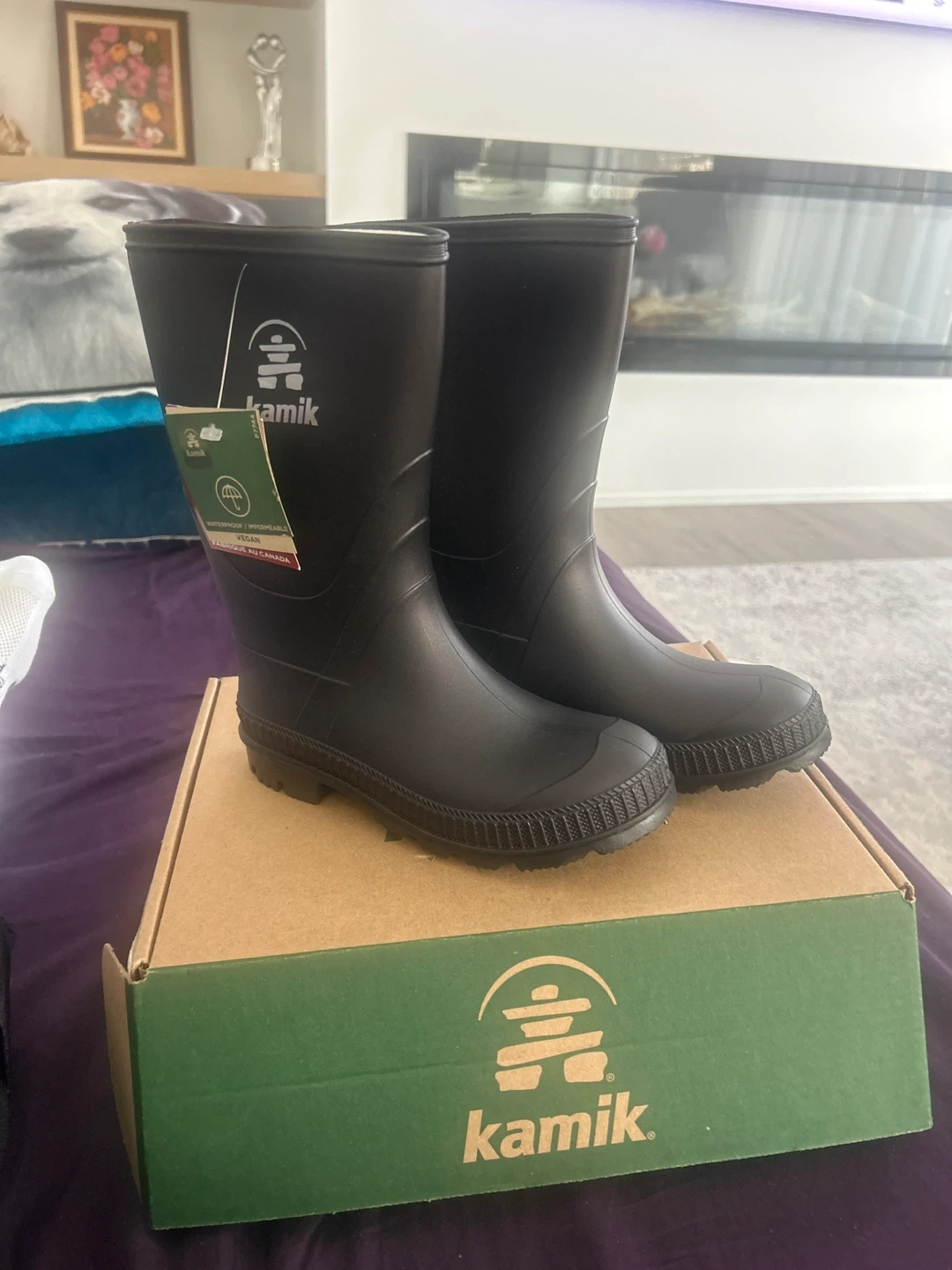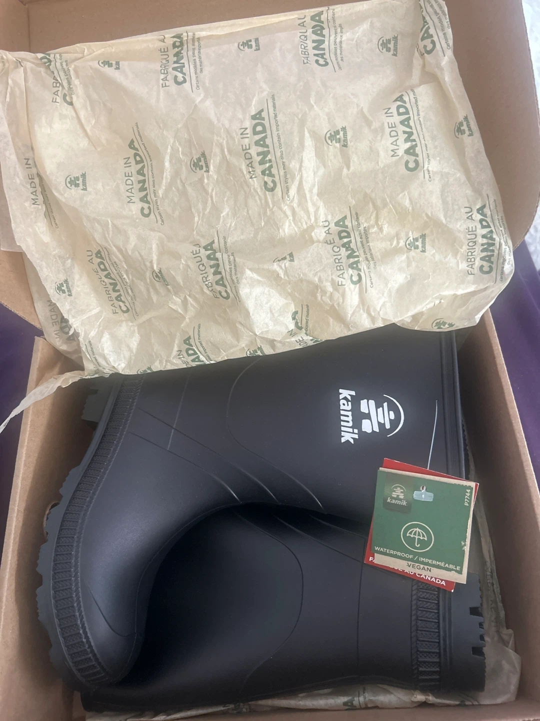 Kamik waterproof vegan rain boots in black. Made in Canada. These boots are durable and ready for any wet weather adventure. They're perfect for keeping your feet dry on rainy spring days.