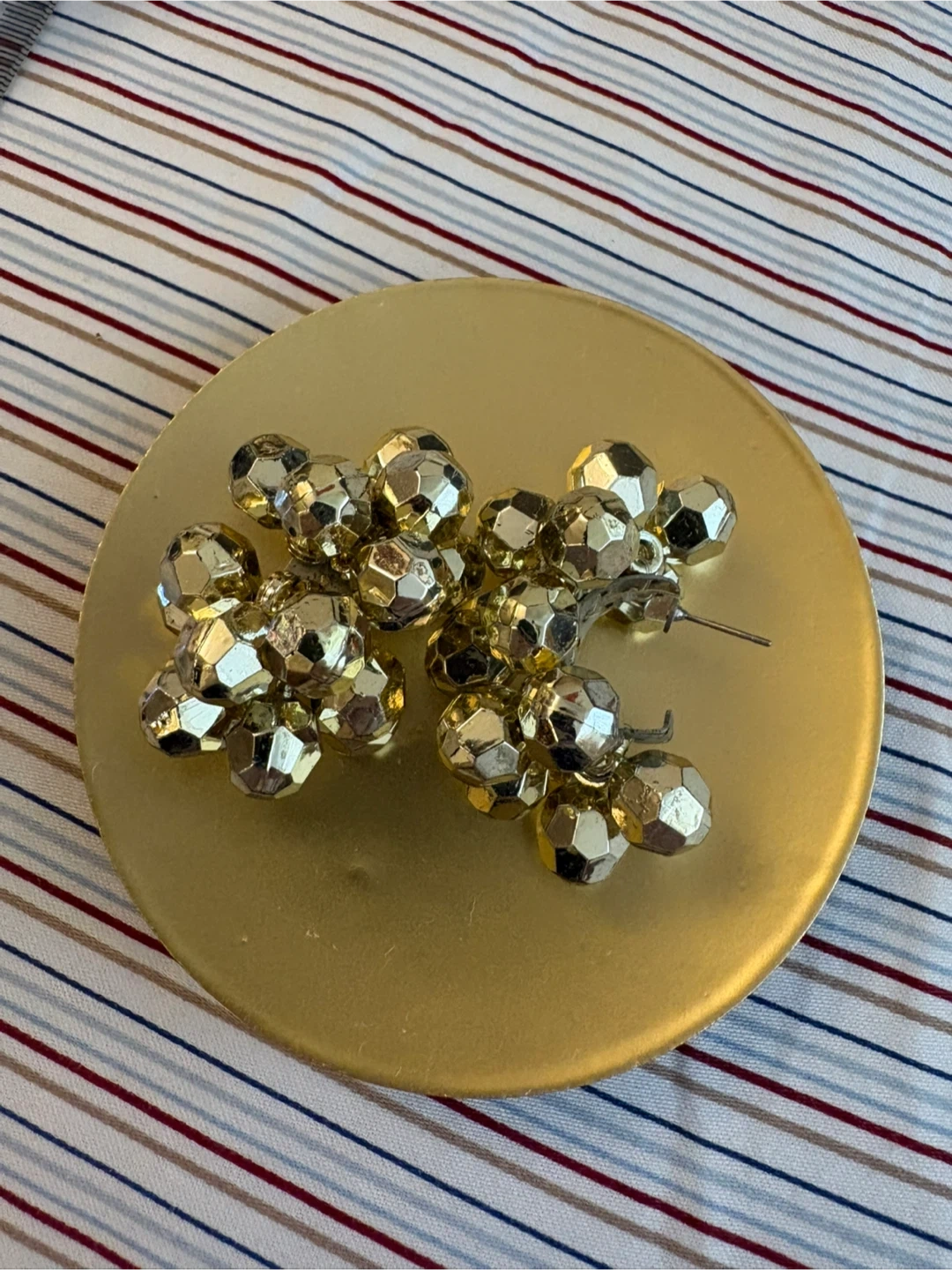 These are a pair of sparkly silver tone cluster earrings. Each earring features multiple faceted beads. The earrings have a post backing.