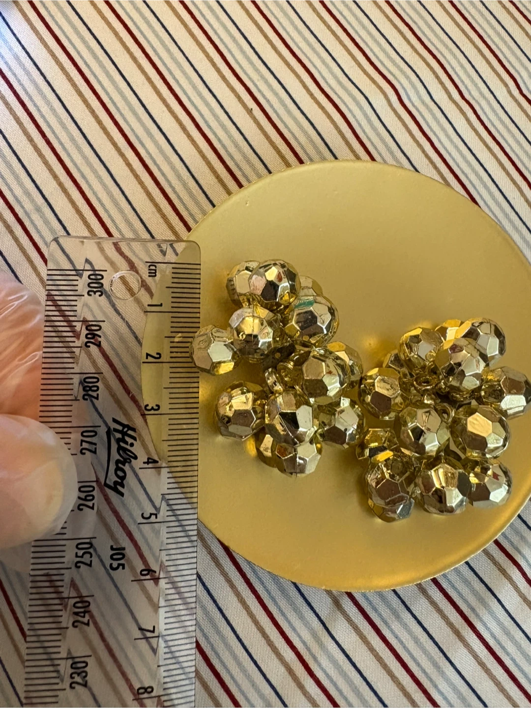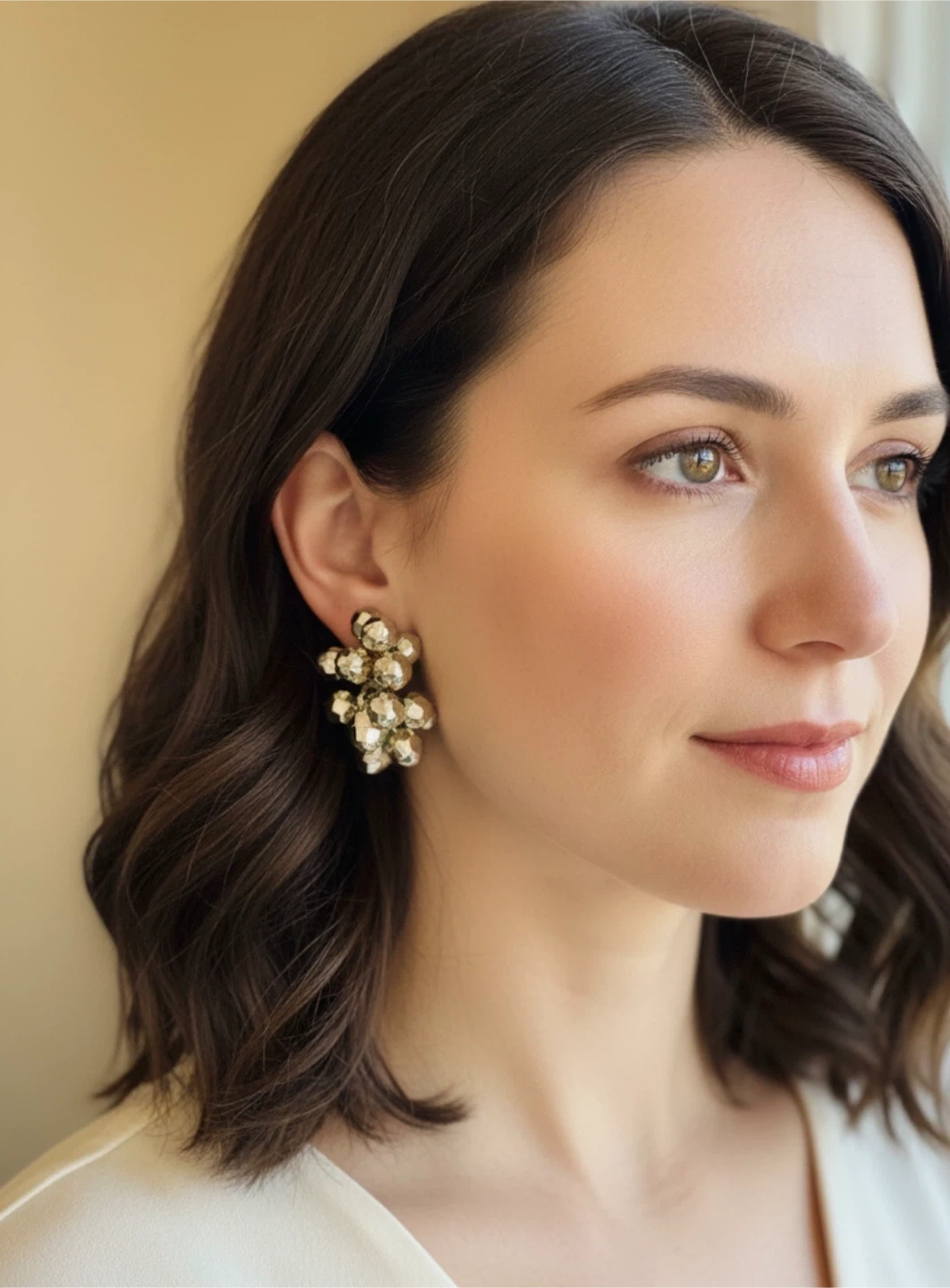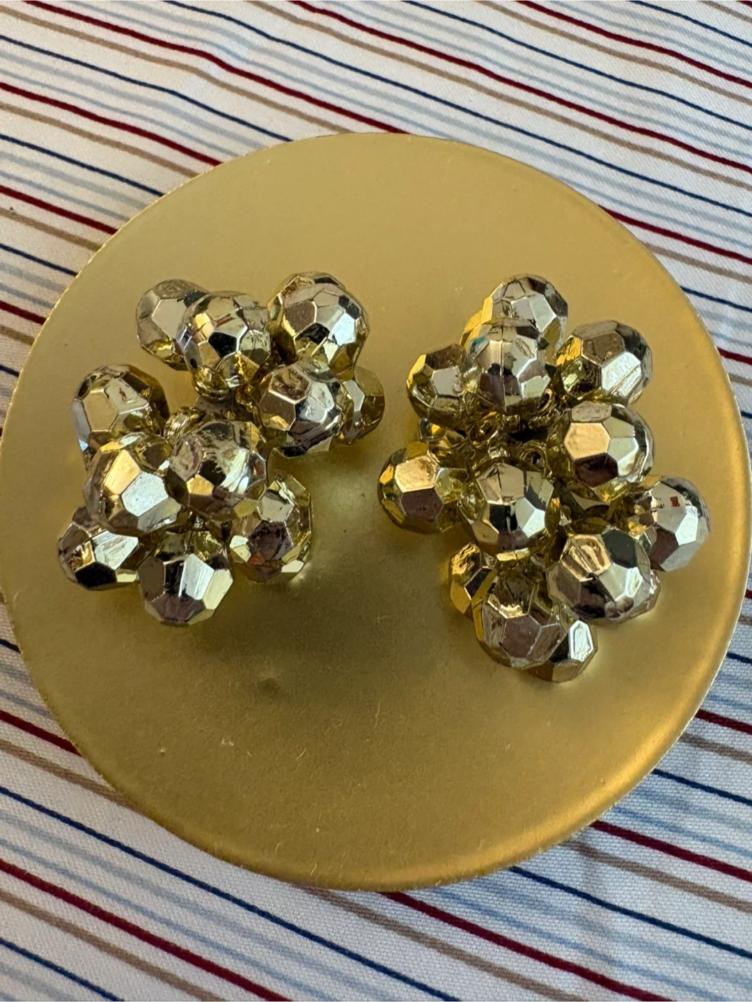 These are a pair of sparkly silver tone cluster earrings. Each earring features multiple faceted beads. The earrings have a post backing.
