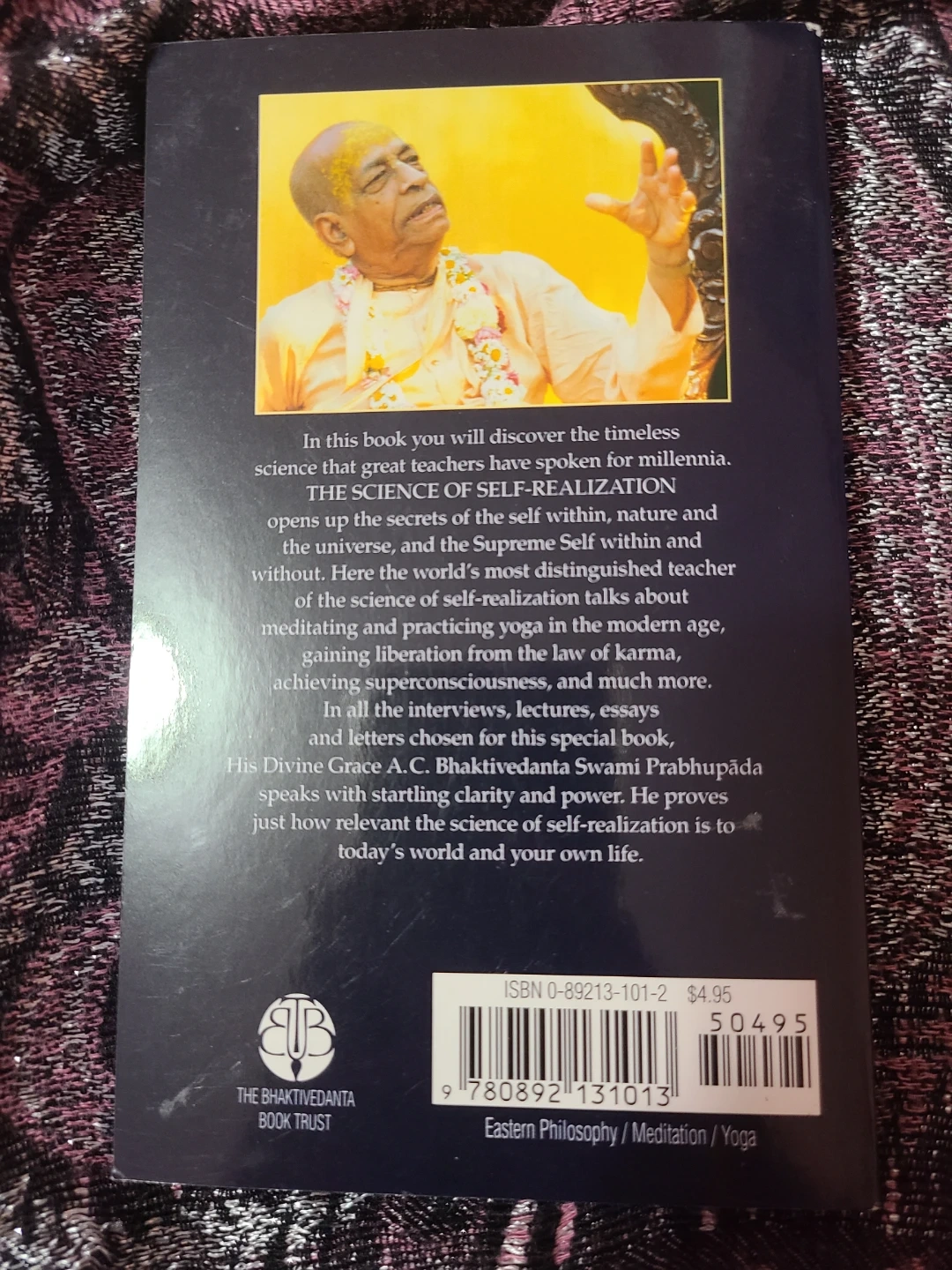 Selling a copy of 'The Science of Self-Realization' by A.C. Bhaktivedanta Swami Prabhupada. It's a book about Eastern Philosophy, Meditation, and Yoga. Perfect for anyone interested in exploring these topics!