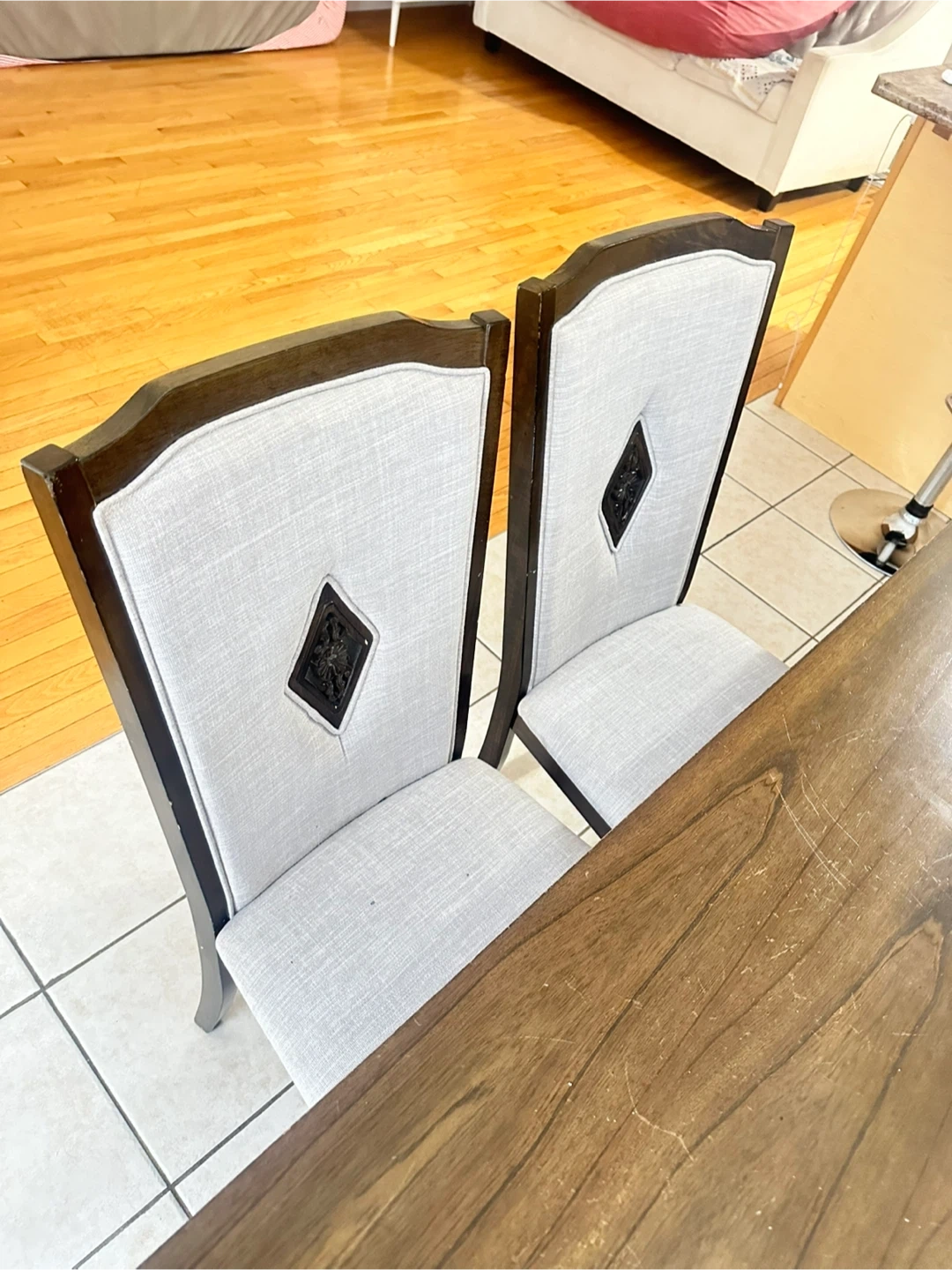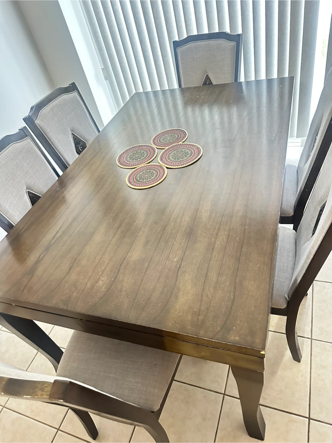 This set includes a wooden dining table and four upholstered chairs. The chairs have grey fabric and dark wood frames. Perfect for family