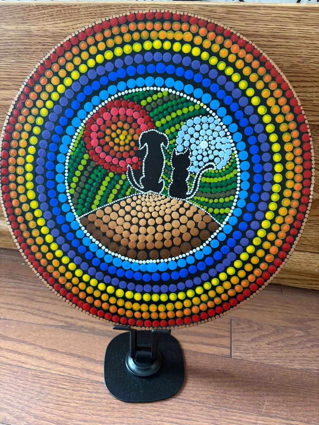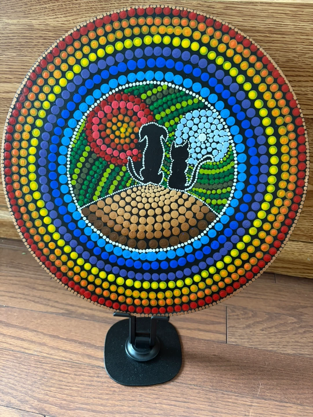 Bring warmth and colour into your home with this one-of-a-kind handmade dot painting featuring two beloved animal silhouettes — a cat and dog — gazing out at a glowing sunset landscape. The scene is beautifully framed by rainbow concentric dot rings in bold reds, blues, greens, yellows, and earth tones, all hand-painted dot by dot.