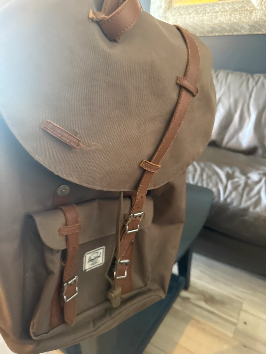 This Herschel Supply Co. backpack is a classic brown canvas with tan leather accents. It features adjustable padded shoulder straps and a main compartment with a drawstring closure. The interior lining is a red and white stripe pattern. Perfect for everyday use or short trips!
