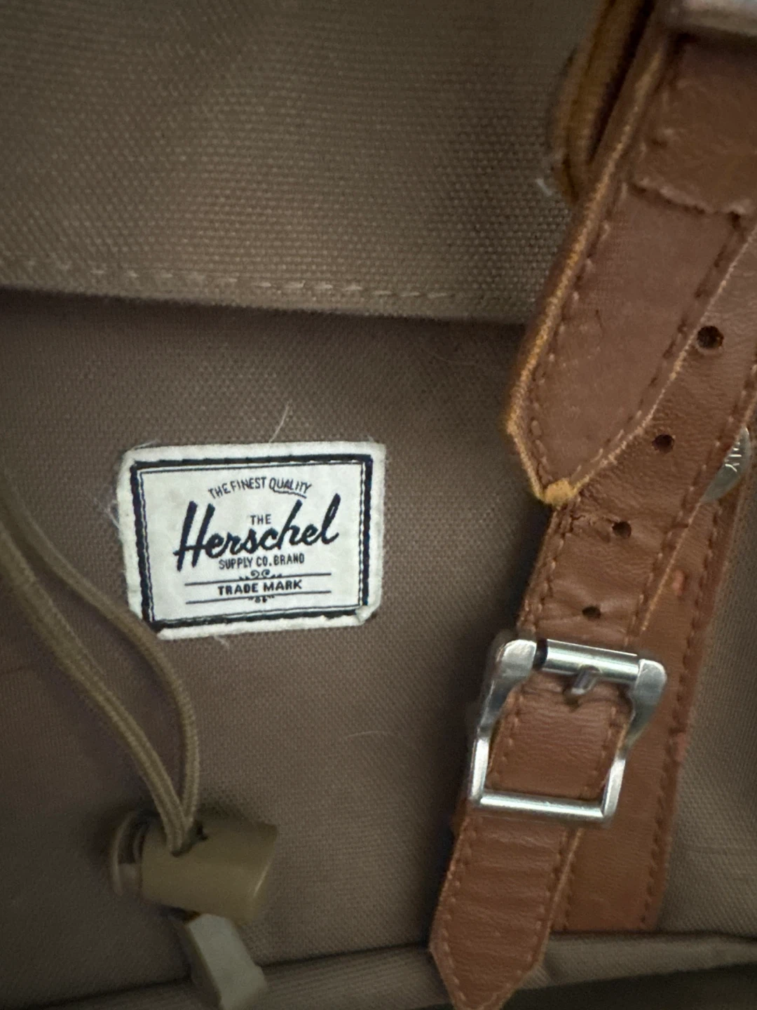 This Herschel Supply Co. backpack is a classic brown canvas with tan leather accents. It features adjustable padded shoulder straps and a main compartment with a drawstring closure. The interior lining is a red and white stripe pattern. Perfect for everyday use or short trips!