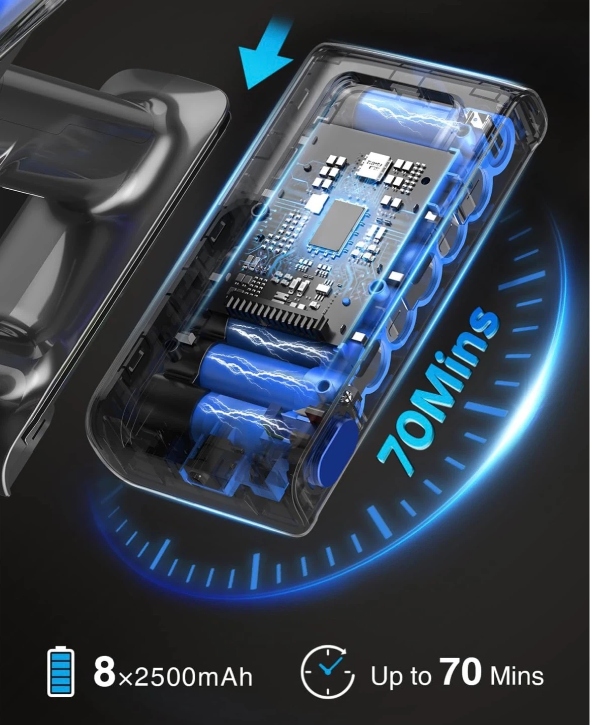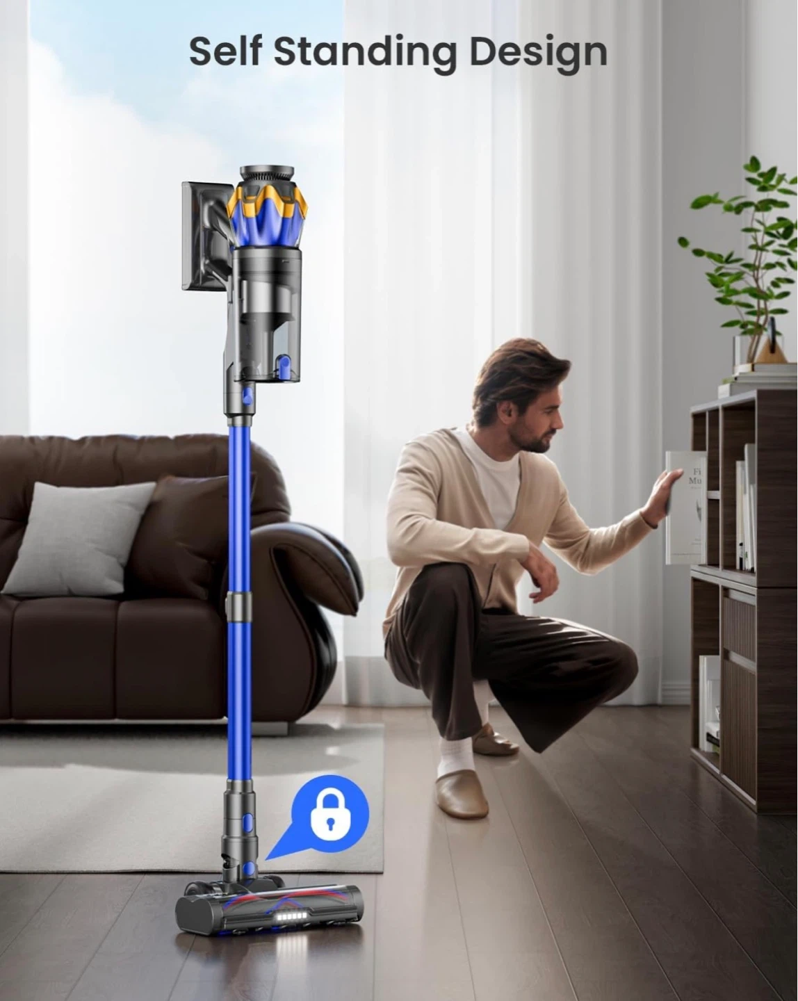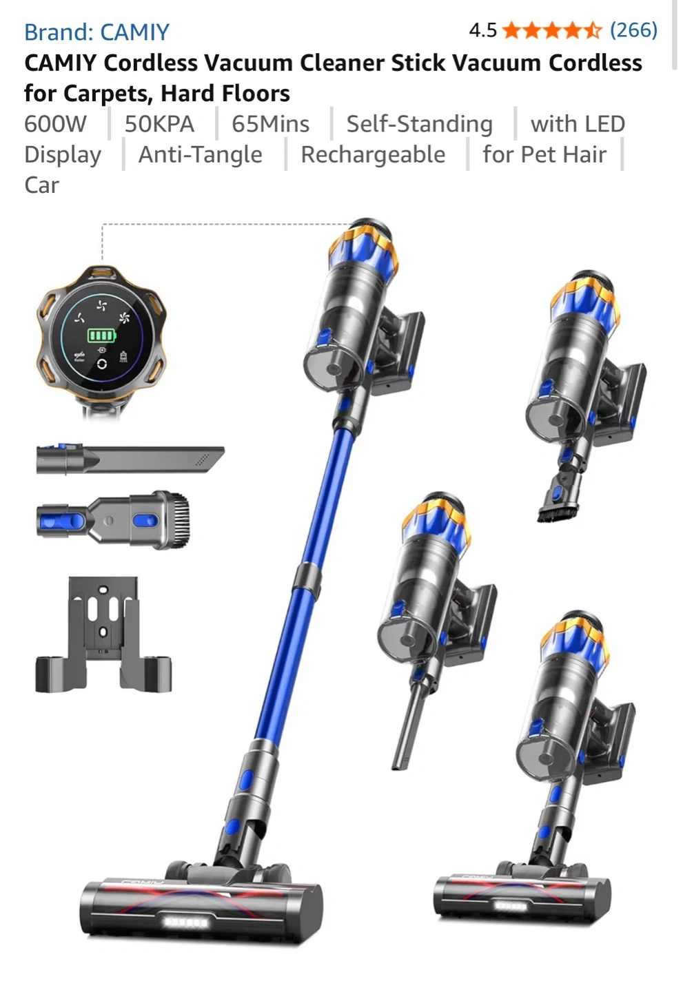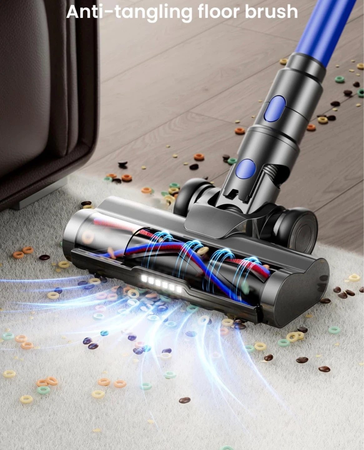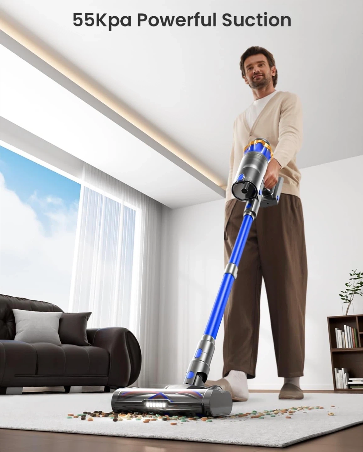 This CAMIY cordless stick vacuum offers a self-standing design and up to 70 minutes of runtime. It features 55KPa powerful suction and an anti-tangling floor brush with LED lights. The vacuum is rechargeable and comes with an 8x2500mAh battery.