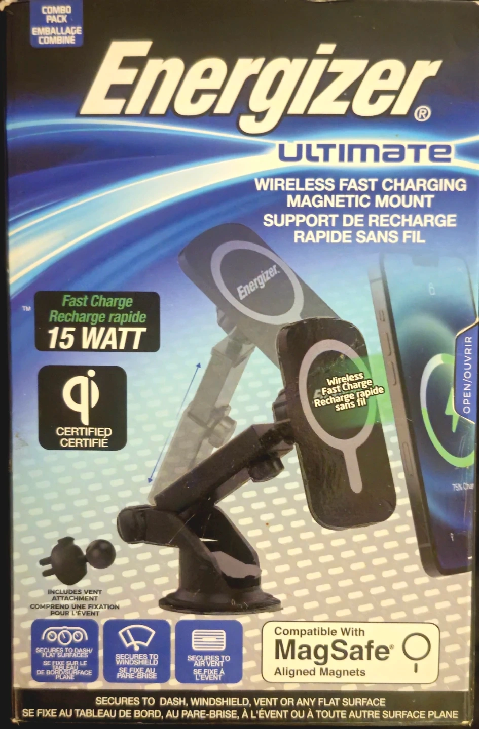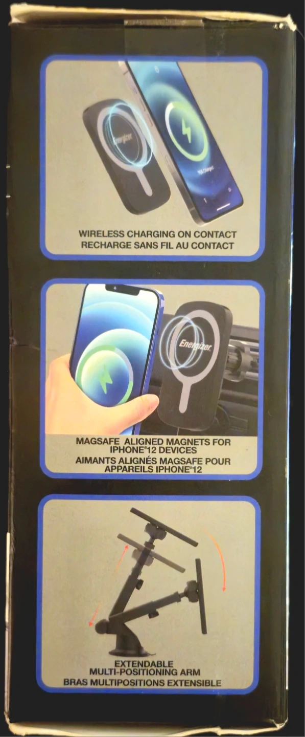 I'm selling a new Energizer Ultimate Wireless Fast Charging Magnetic Mount. This charger is a 15-watt Qi-certified device compatible with MagSafe. It secures to dash, windshield, vent or any flat surface.