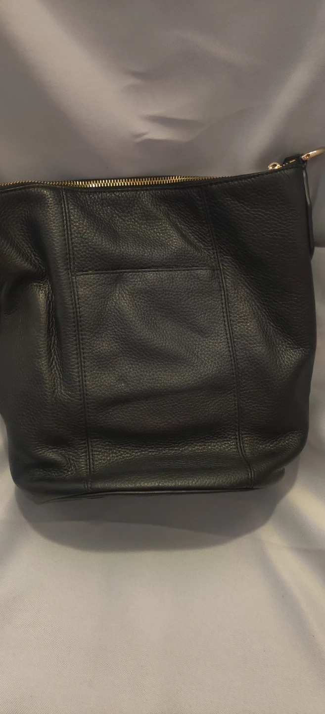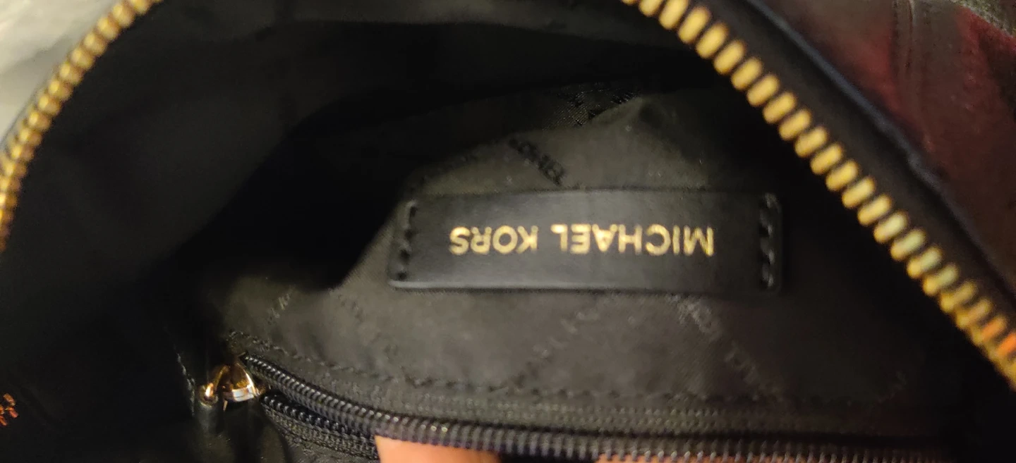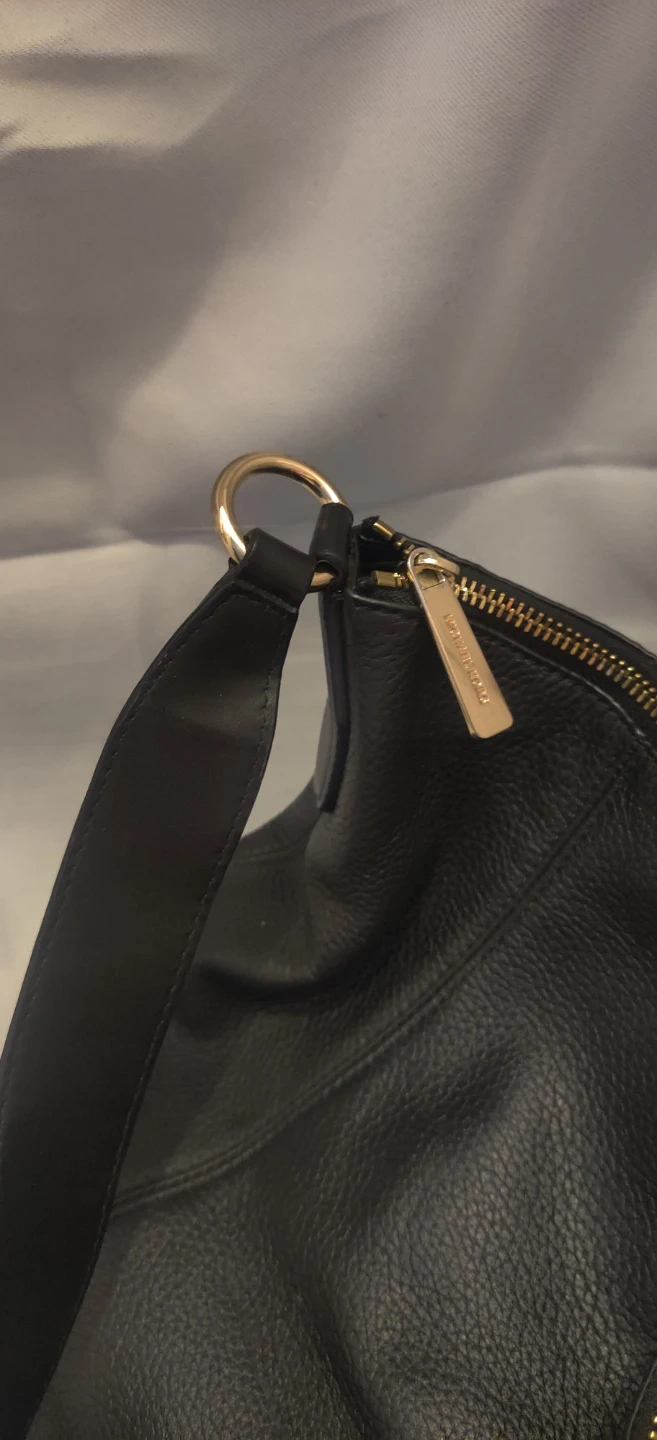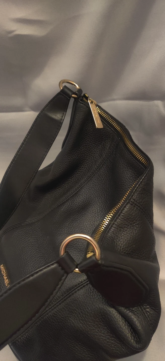 This is a black leather hobo bag by Michael Kors. It's made of genuine leather with gold-tone hardware. Plenty of space inside for all your essentials!