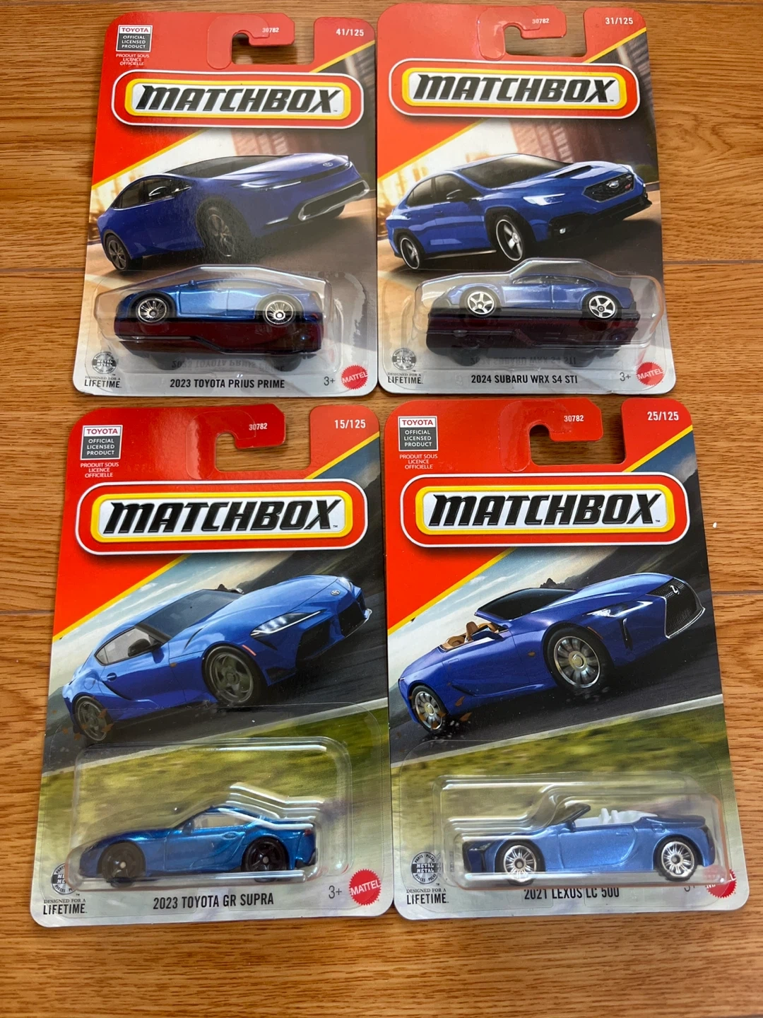This listing includes four Matchbox die-cast cars: a 2023 Toyota Prius Prime, a 2024 Subaru WRX S4 STI, a 2023 Toyota GR Supra, and a 2021 Lexus LC 500. Each car is officially licensed and designed for a lifetime of play. These are great collectibles for car enthusiasts.