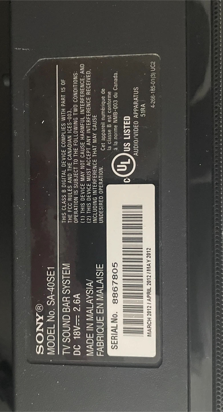This is a Sony SA-40SE1 TV Sound Bar System. It runs on 18V DC and draws 2.6A. It was made in Malaysia. It's useful for enhancing TV audio. Cash only buyer collects