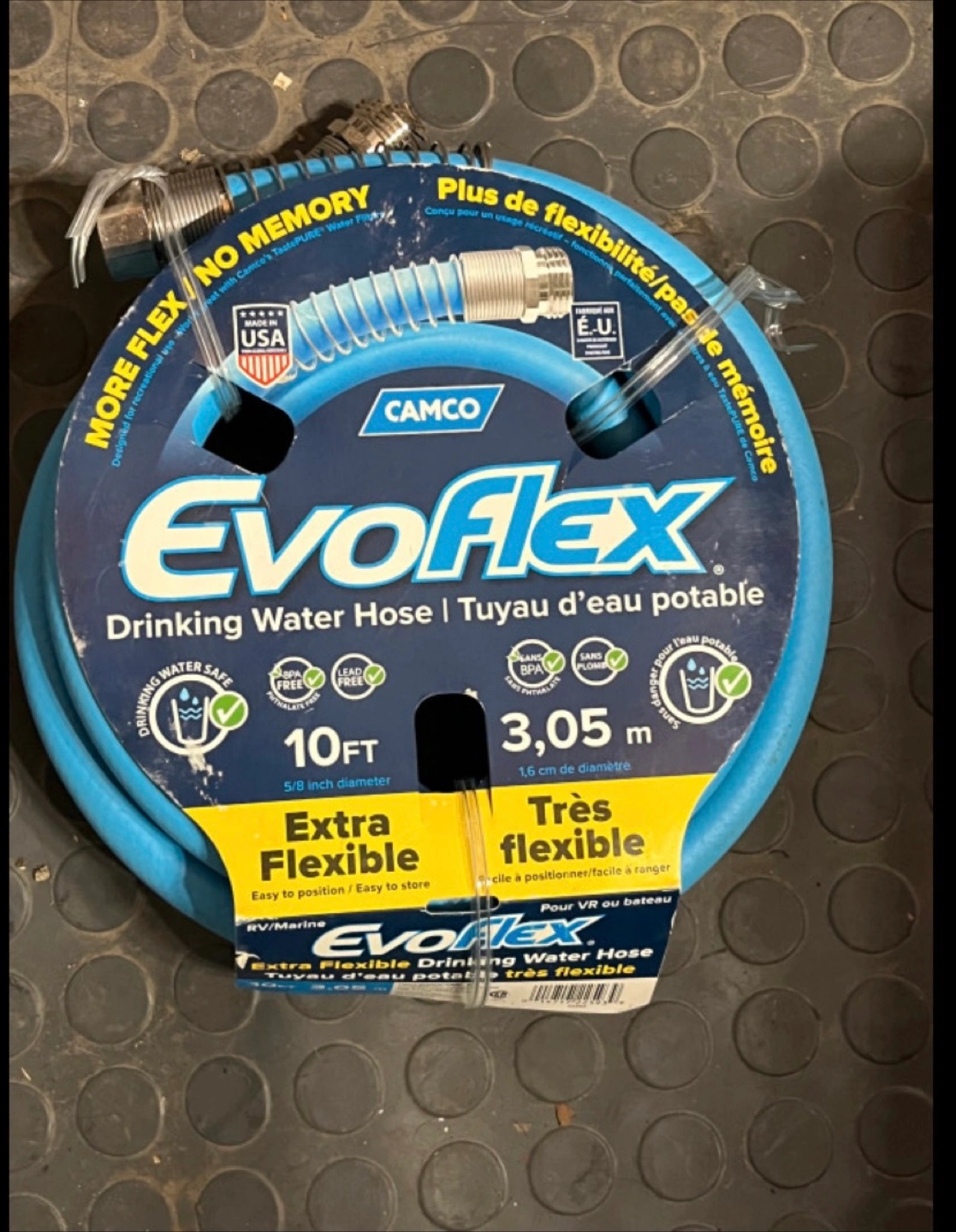 Selling a Camco EvoFlex drinking water hose! It's 10 feet long and 5/8 inch diameter. It's designed for recreational use and is extra flexible, making it easy to position and store. It's also safe for drinking water and is BPA and phthalate free
