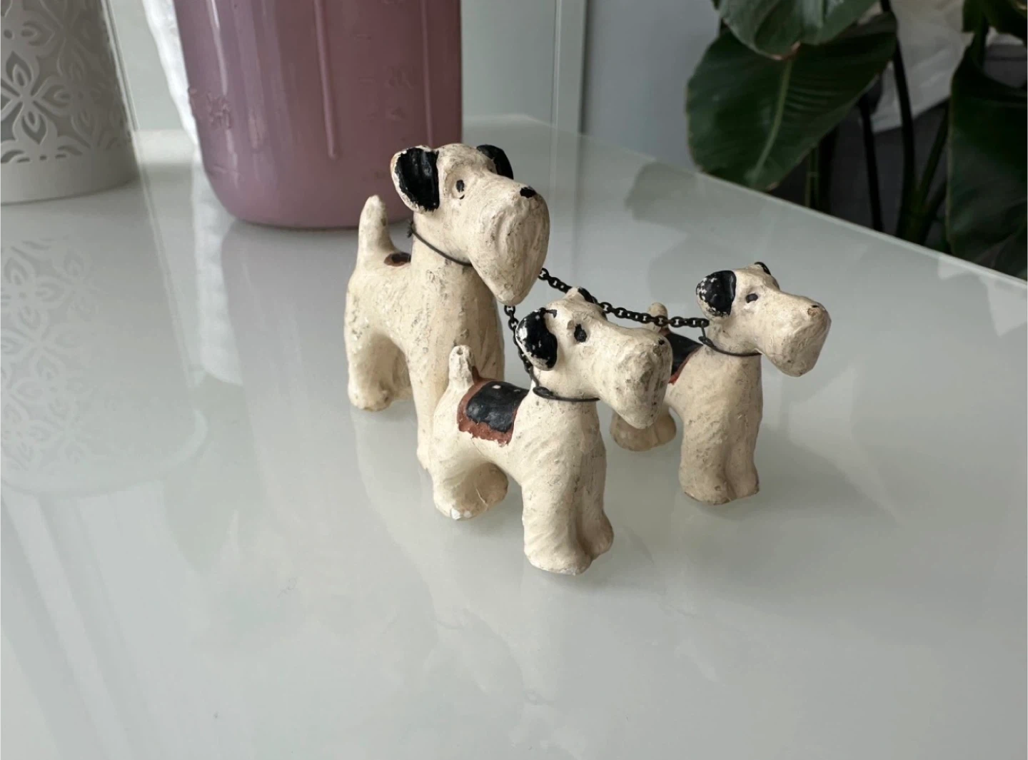 Here's a charming set of three dog figurines, perfect for adding a touch of whimsy to your decor. They're connected by a metal chain leash, giving them a unique character. The dogs appear to be a terrier breed. They're a lovely decorative piece for any dog lover's home!
