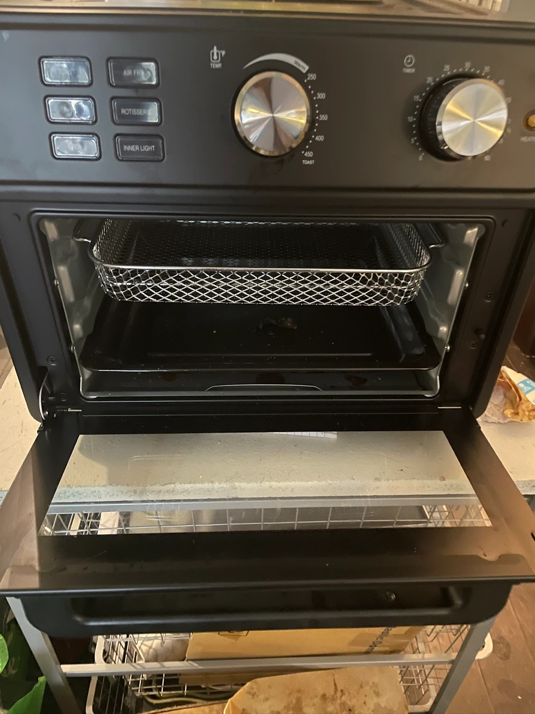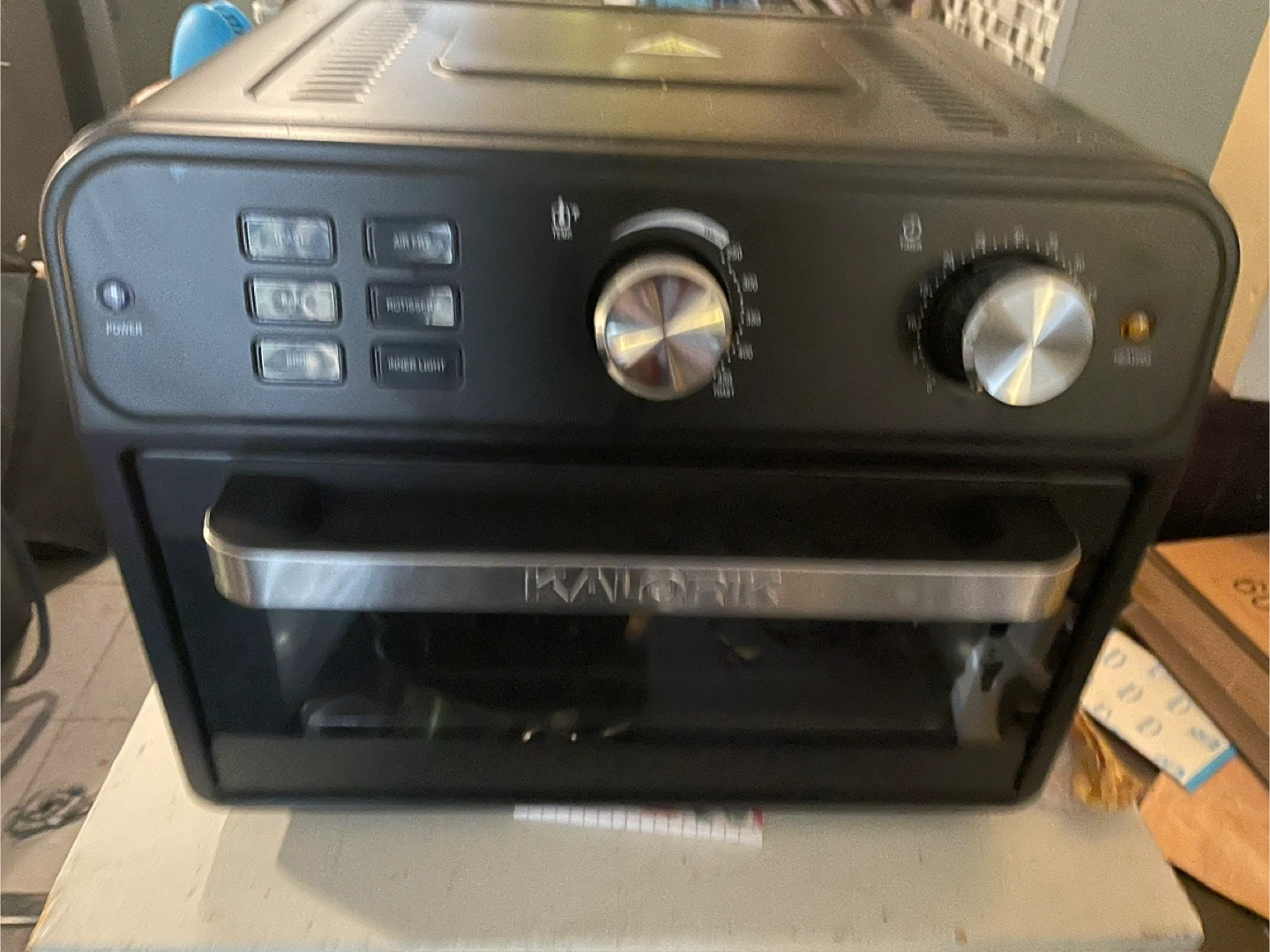 Selling a black Kalorik air fryer oven. It has settings for toast, air fry, bake, rotisserie, broil, and inner light. Great for cooking a variety of meals!