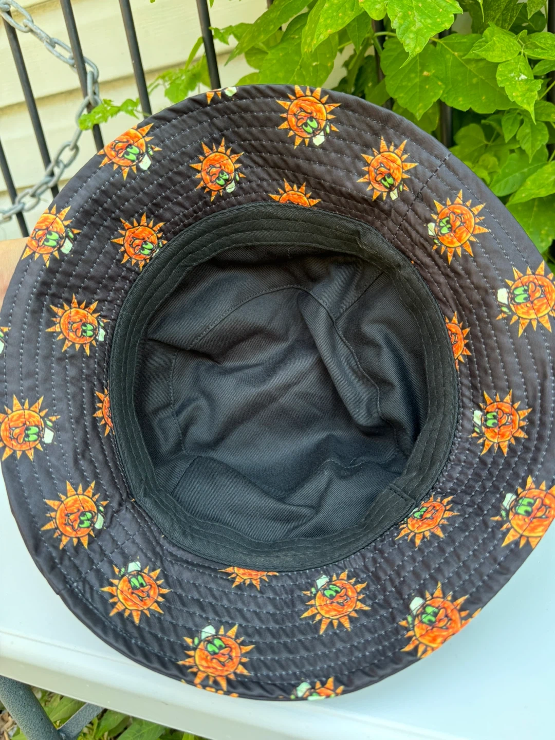 Bucket hat with a fun all-over print of cartoon suns. Black background with orange and green sun graphics. It's made of a smooth fabric. Great for sunny days!