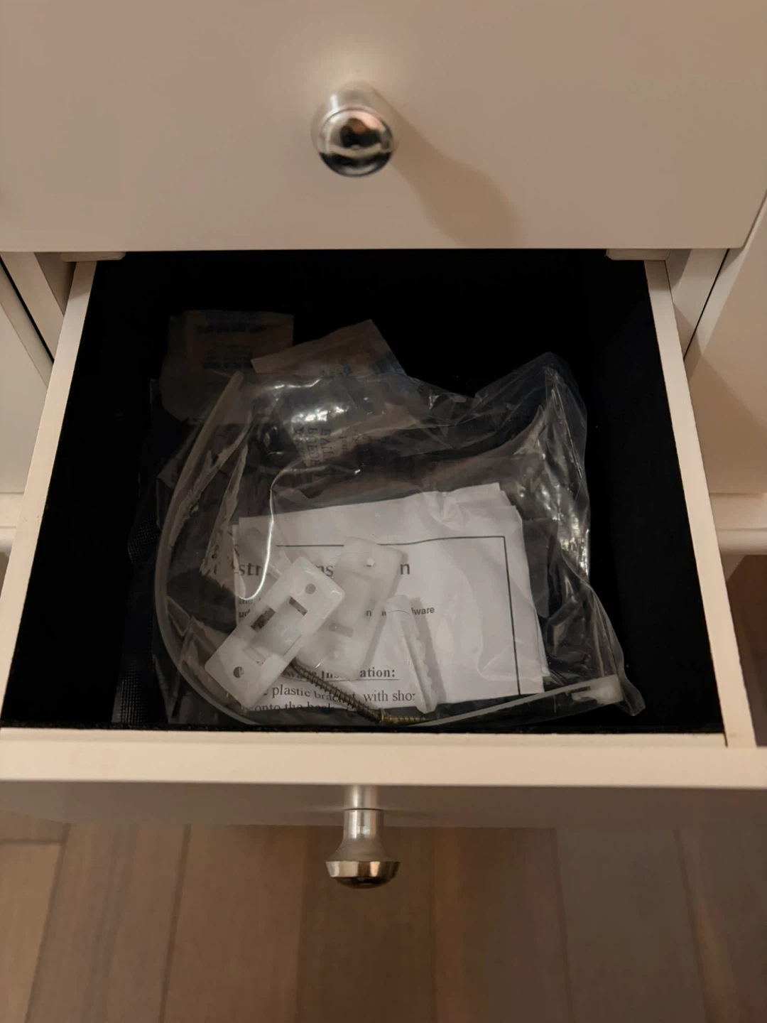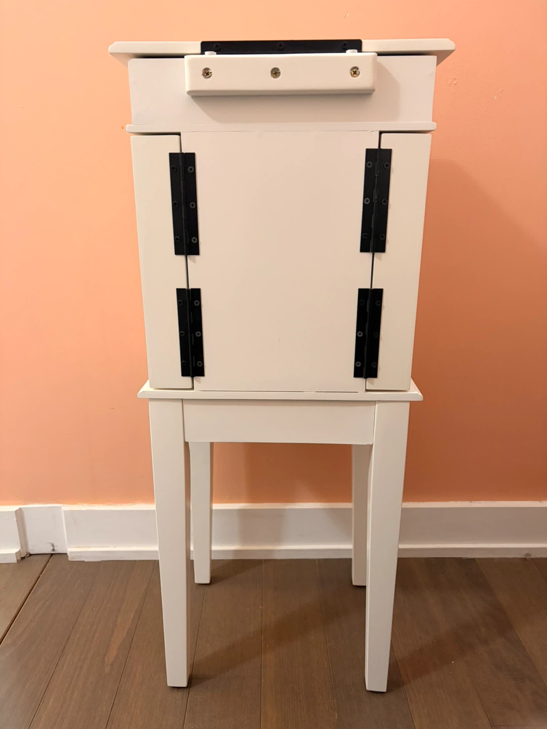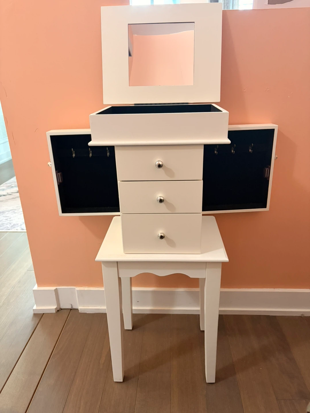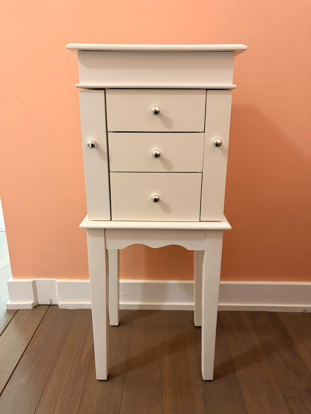White jewellery cabinet with multiple drawers and side doors, includes a mirror and ring holder pads. Hardware is included for wall mounting. Perfect for organizing accessories, including watches, rings, bracelets, necklaces and more!