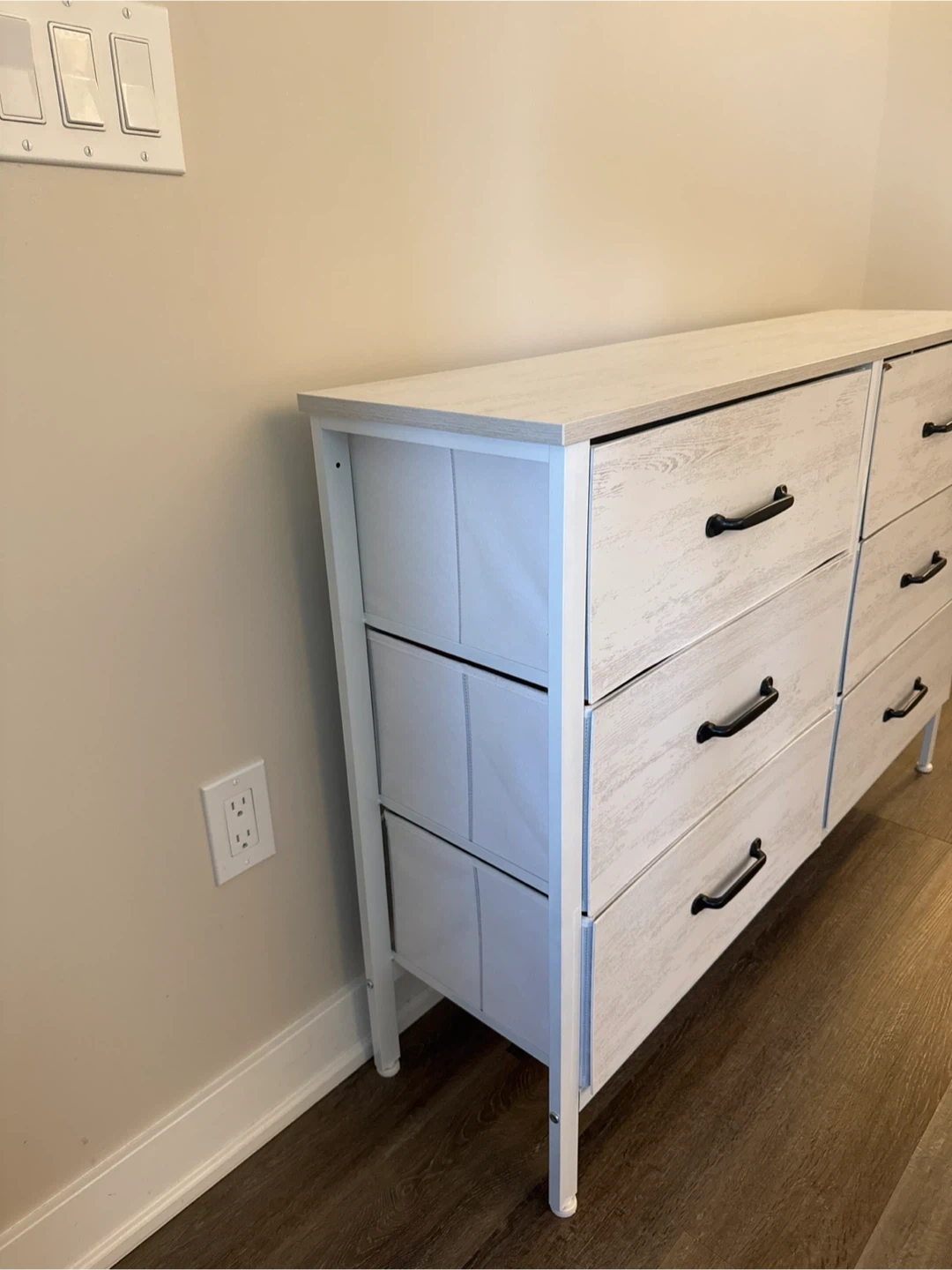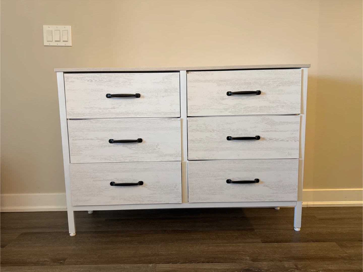 Selling a white dresser with six drawers! It's perfect for adding some extra storage to any room. The drawers have sleek black handles, and the overall design is simple and elegant. It's ready for a new home