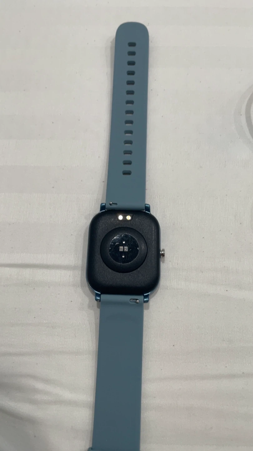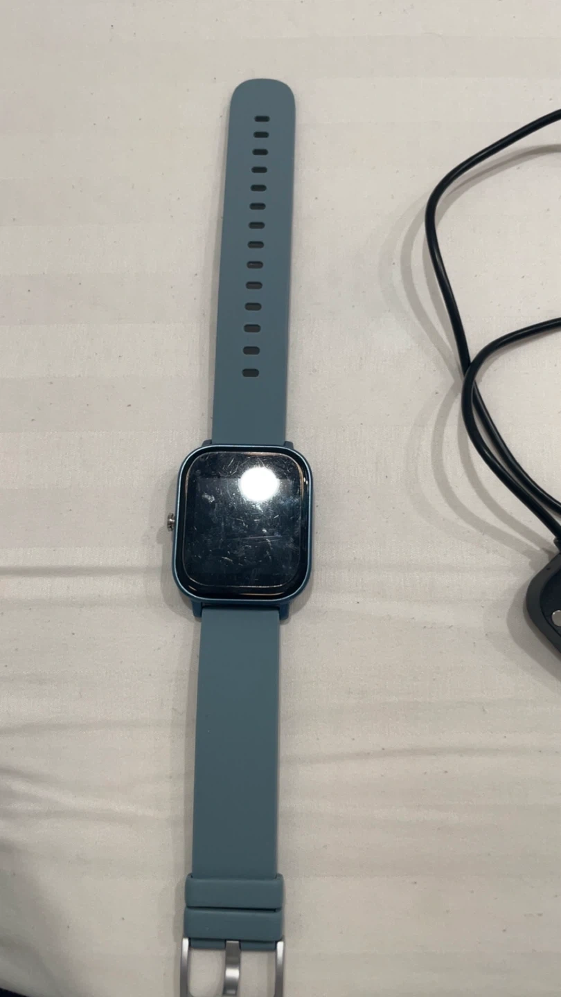 Selling a blue smartwatch that's in good condition! It comes with its charger, so it's ready to go. It's a great little gadget for tracking your steps and staying connected.