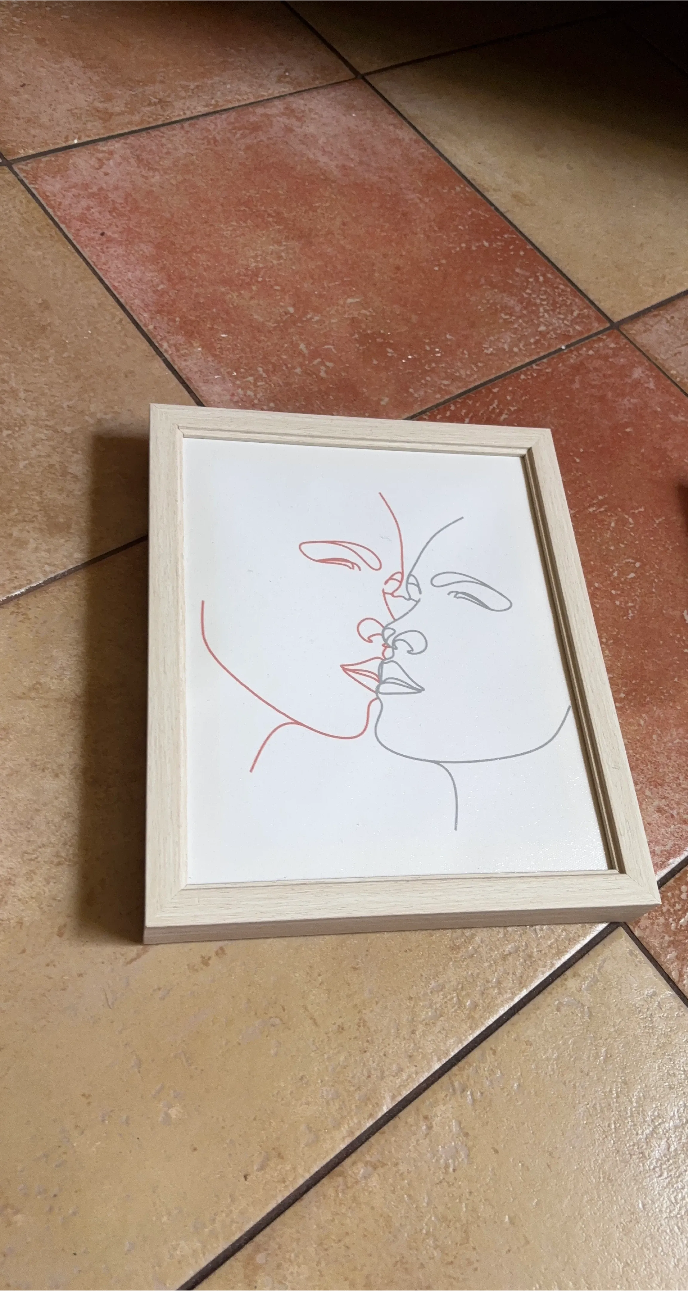 This framed print features a minimalist line art design of two faces in a kiss. The art uses red and gray lines on a white background, presented in a light wood-tone frame. It's a modern piece for home decor.