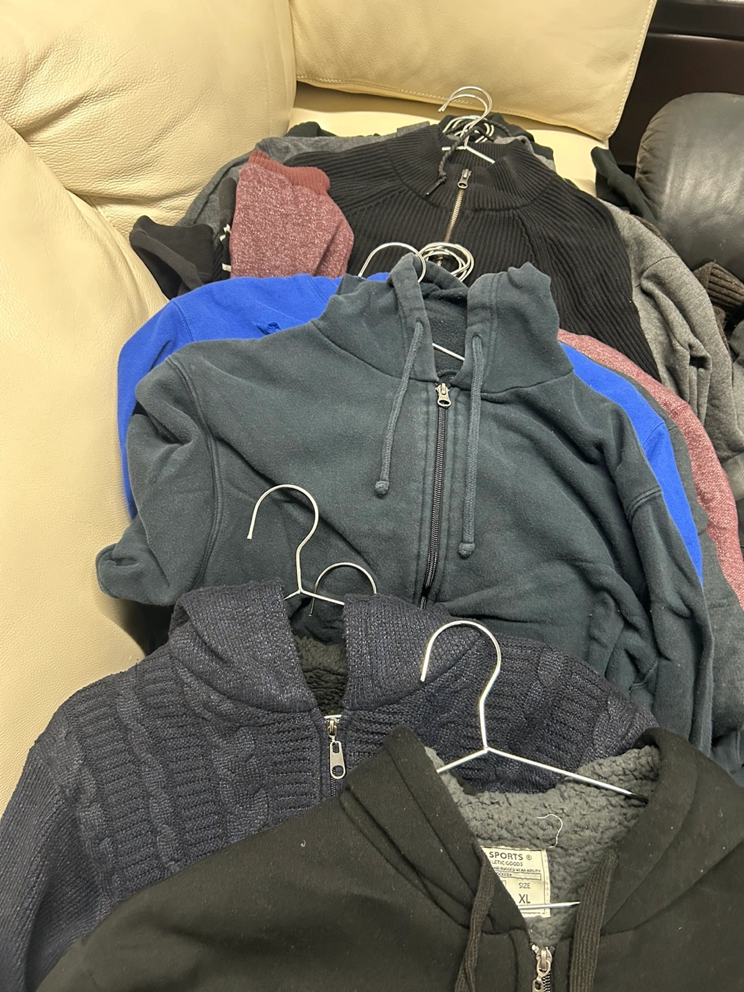 Large bundle of men's zip-up hoodies and sweaters. Various colours and styles. Includes mostly size XL. Great for layering or everyday wear. $150 for the bundle