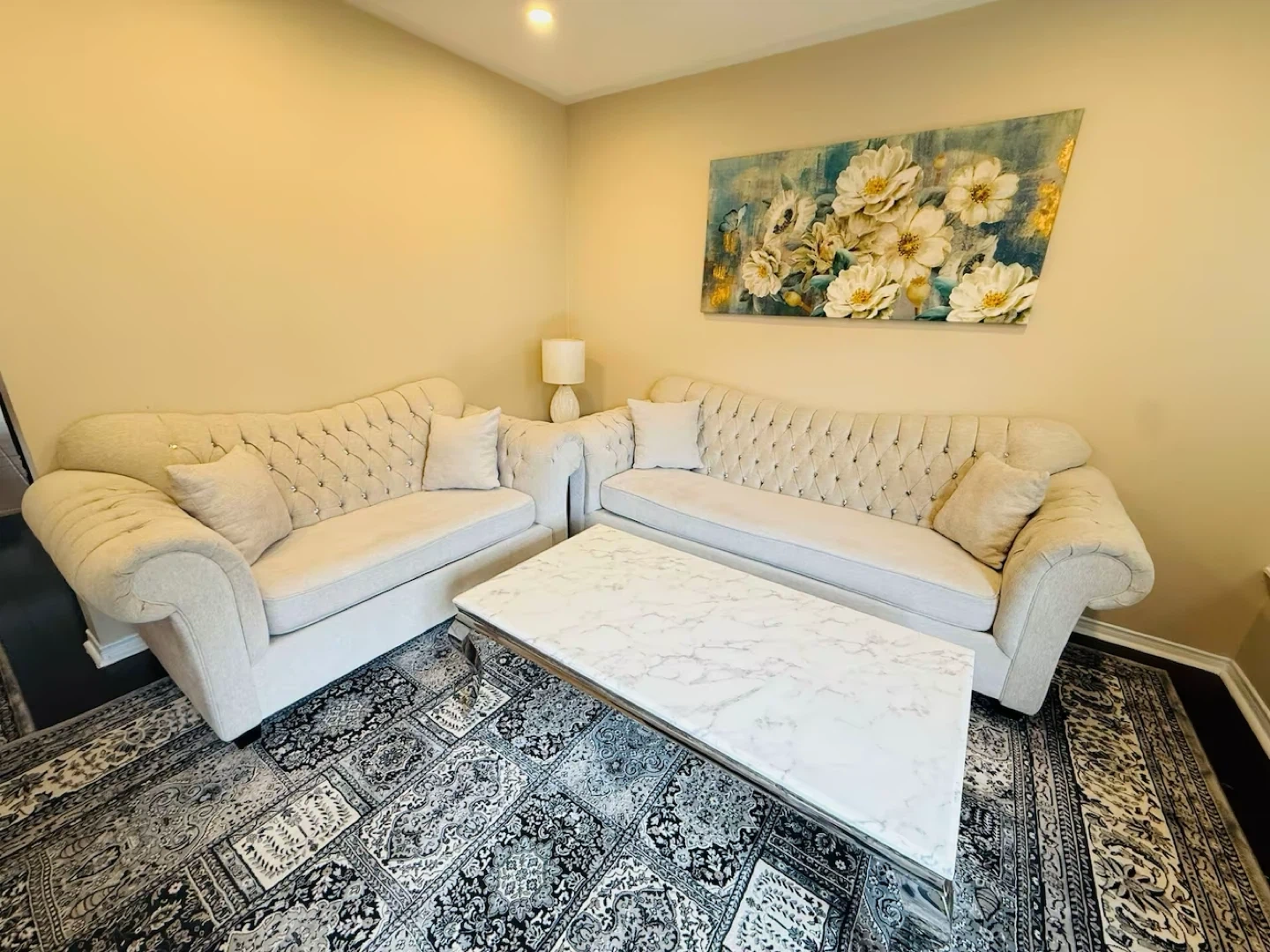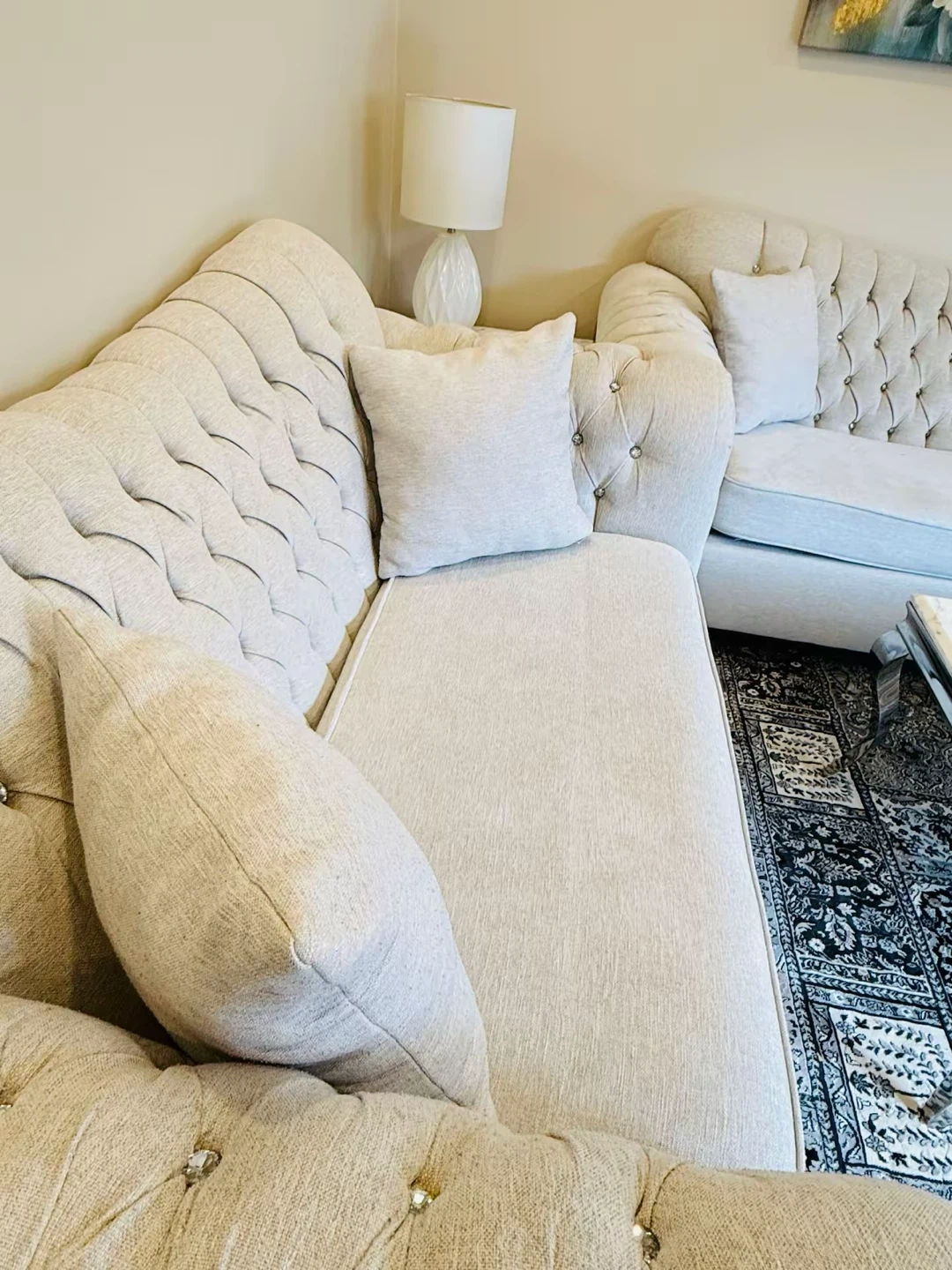 Elegant tufted sofa set in a light beige fabric. It includes a chaise lounge sofa and a matching loveseat. Comes with accent pillows.