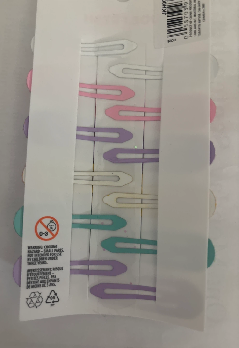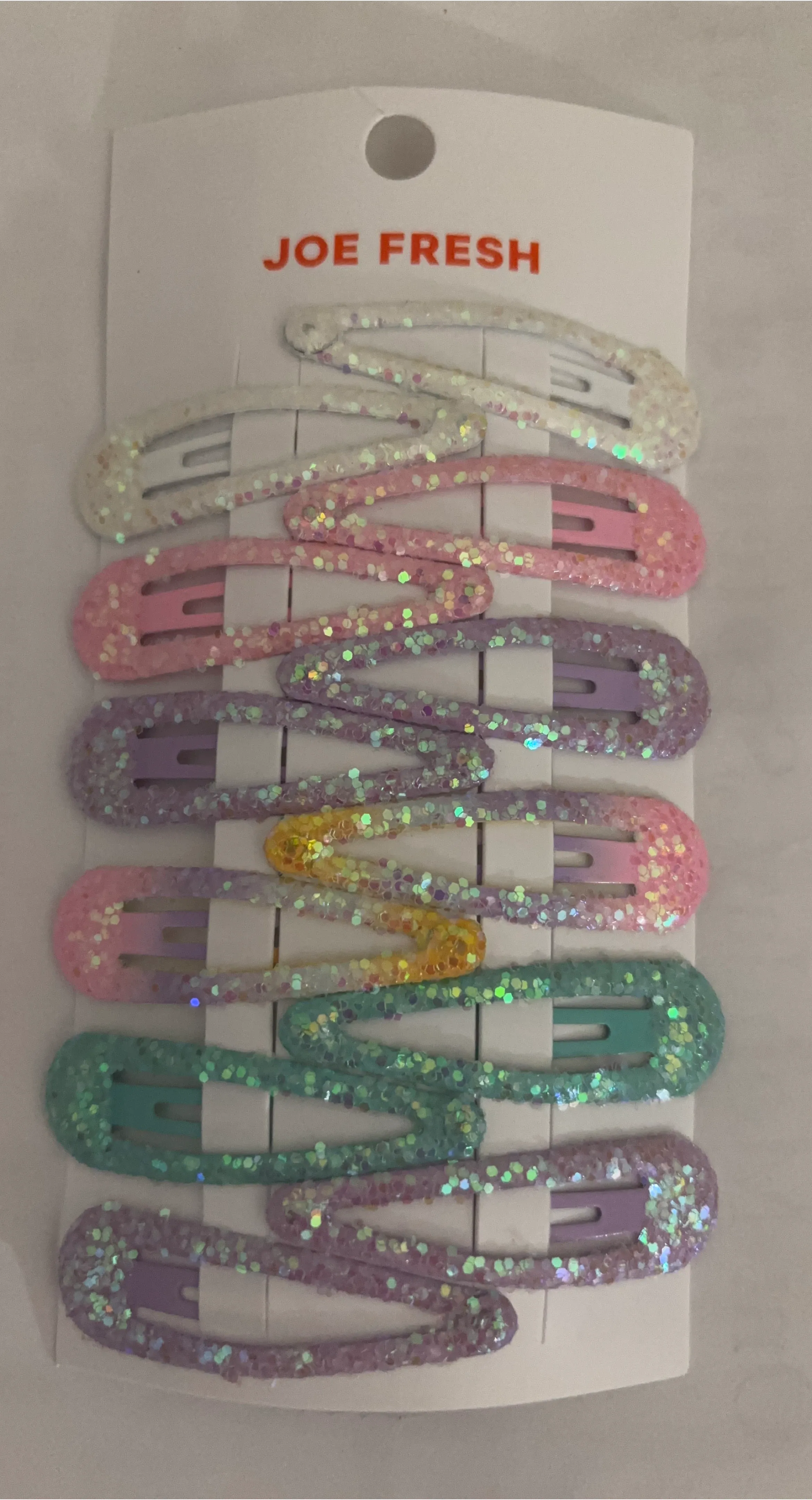 This set includes 12 Joe Fresh snap hair clips in various pastel colours with a glitter finish. They're perfect for keeping hair tidy . Recommended for ages 3 and up.