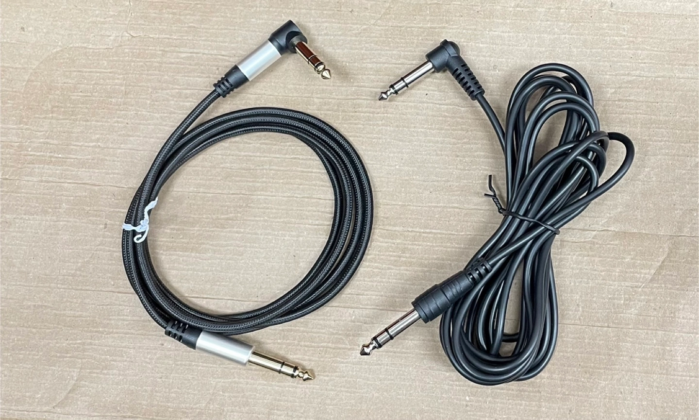 Two audio cables are shown, each with a 1/4 inch TRS connector on one end and a right-angle 1/4 inch TRS connector on the other. One cable has a braided black and silver finish, while the other has a standard black finish. These cables are suitable for connecting audio equipment.