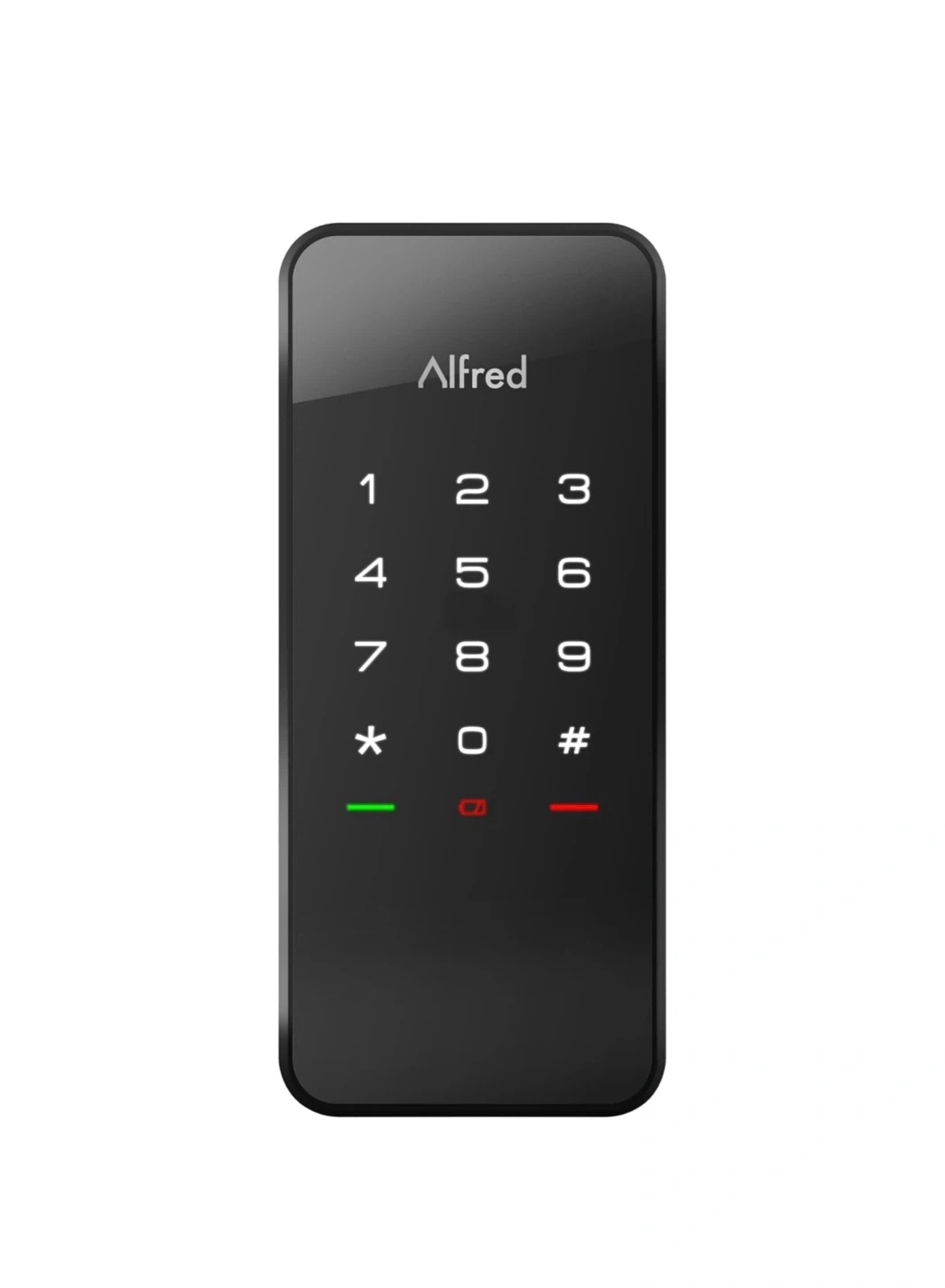 This is an Alfred electronic keypad lock. It features a black finish and a digital numeric interface for entry codes. The lock has indicator lights for status.